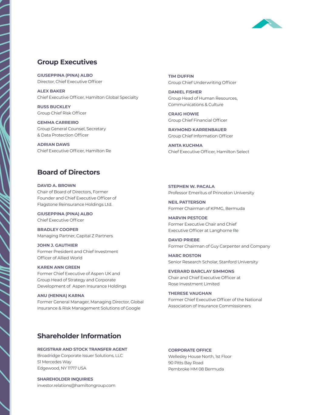 TIM DUFFIN Group Chief Underwriting Officer DANIEL FISHER Group Head of Human Resources, Communications & Culture CRAIG HOWIE Group Chief Financial Officer RAYMOND KARRENBAUER Group Chief Information Officer ANITA KUCHMA Chief Executive Officer, Hamilton Select CORPORATE OFFICE Wellesley House North, 1st Floor 90 Pitts Bay Road Pembroke HM 08 Bermuda Group Executives GIUSEPPINA (PINA) ALBO Director, Chief Executive Officer ALEX BAKER Chief Executive Officer, Hamilton Global Specialty RUSS BUCKLEY Group Chief Risk Officer GEMMA CARREIRO Group General Counsel, Secretary & Data Protection Officer ADRIAN DAWS Chief Executive Officer, Hamilton Re Board of Directors DAVID A. BROWN Chair of Board of Directors, Former Founder and Chief Executive Officer of Flagstone Reinsurance Holdings Ltd. GIUSEPPINA (PINA) ALBO Chief Executive Officer BRADLEY COOPER Managing Partner, Capital Z Partners JOHN J. GAUTHIER Former President and Chief Investment Officer of Allied World KAREN ANN GREEN Former Chief Executive of Aspen UK and Group Head of Strategy and Corporate Development of Aspen Insurance Holdings ANU (HENNA) KARNA Former General Manager, Managing Director, Global Insurance & Risk Management Solutions of Google Shareholder Information REGISTRAR AND STOCK TRANSFER AGENT Broadridge Corporate Issuer Solutions, LLC 51 Mercedes Way Edgewood, NY 11717 USA SHAREHOLDER INQUIRIES investor.relations@hamiltongroup.com STEPHEN W. PACALA Professor Emeritus of Princeton University NEIL PATTERSON Former Chairman of KPMG, Bermuda MARVIN PESTCOE Former Executive Chair and Chief Executive Officer at Langhorne Re DAVID PRIEBE Former Chairman of Guy Carpenter and Company MARC ROSTON Senior Research Scholar, Stanford University EVERARD BARCLAY SIMMONS Chair and Chief Executive Officer at Rose Investment Limited THERESE VAUGHAN Former Chief Executive Officer of the National Association of Insurance Commissioners