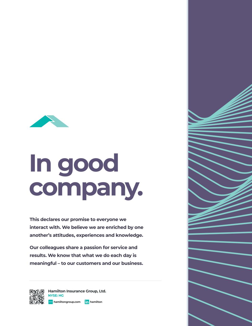 hamilton Hamilton Insurance Group, Ltd. NYSE: HG hamiltongroup.com This declares our promise to everyone we interact with. We believe we are enriched by one another’s attitudes, experiences and knowledge. Our colleagues share a passion for service and results. We know that what we do each day is meaningful – to our customers and our business.