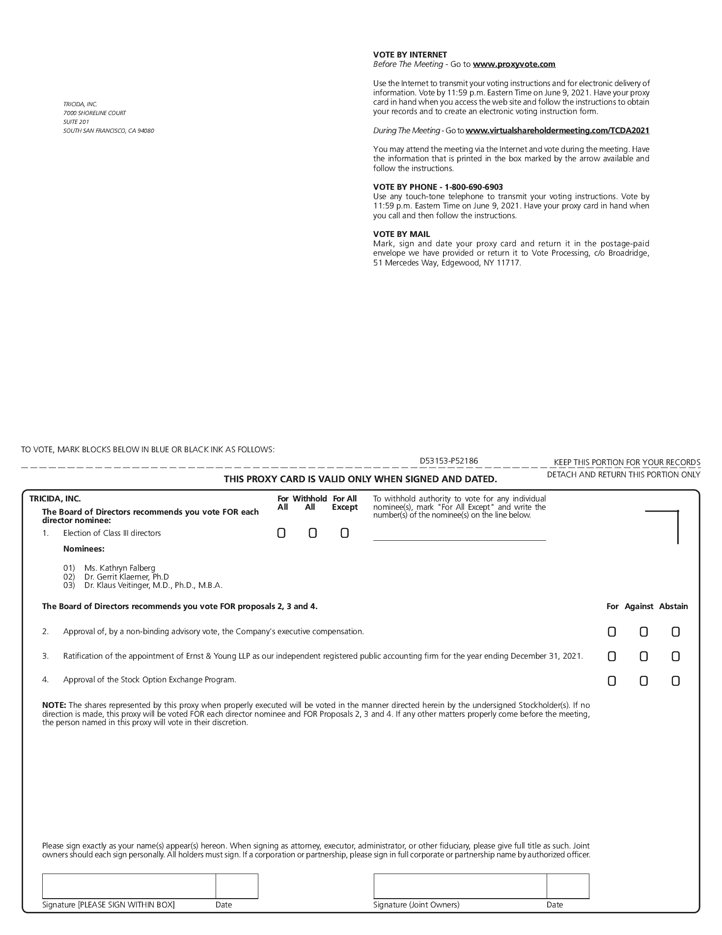Admittance is limited to stockholders of the Company. You will be able to attend the Annual Meeting online and submit your questions during the meeting by visiting www.virtualshareholdermeeting.com/TCDA2021. Such questions must be confined to matters properly before the Annual Meeting and of general company concern. You will also be able to vote your shares electronically at the Annual Meeting. To participate, you will need your 16-digit control number included in your proxy materials, on your proxy card, or on the instructions that accompanied your proxy materials. We encourage you to access the meeting prior to the start time. Online access will open at 7:15 a.m. Pacific Daylight Time, and you should allow ample time to log in to the meeting webcast and test your computer audio system. We recommend that you carefully review the procedures needed to gain admission in advance.