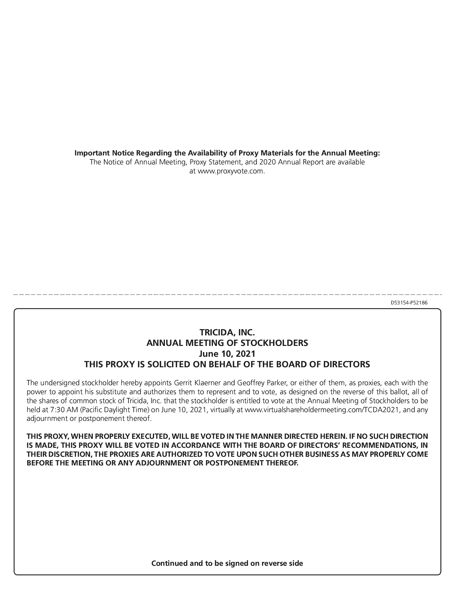 NOTICE IS HEREBY GIVEN that the 2021 annual meeting of stockholders of Tricida, Inc., a Delaware corporation, will be held on June 10, 2021, at 7:30 a.m. Pacific Daylight Time in a virtual meeting format only at www.virtualshareholdermeeting.com/TCDA2021.