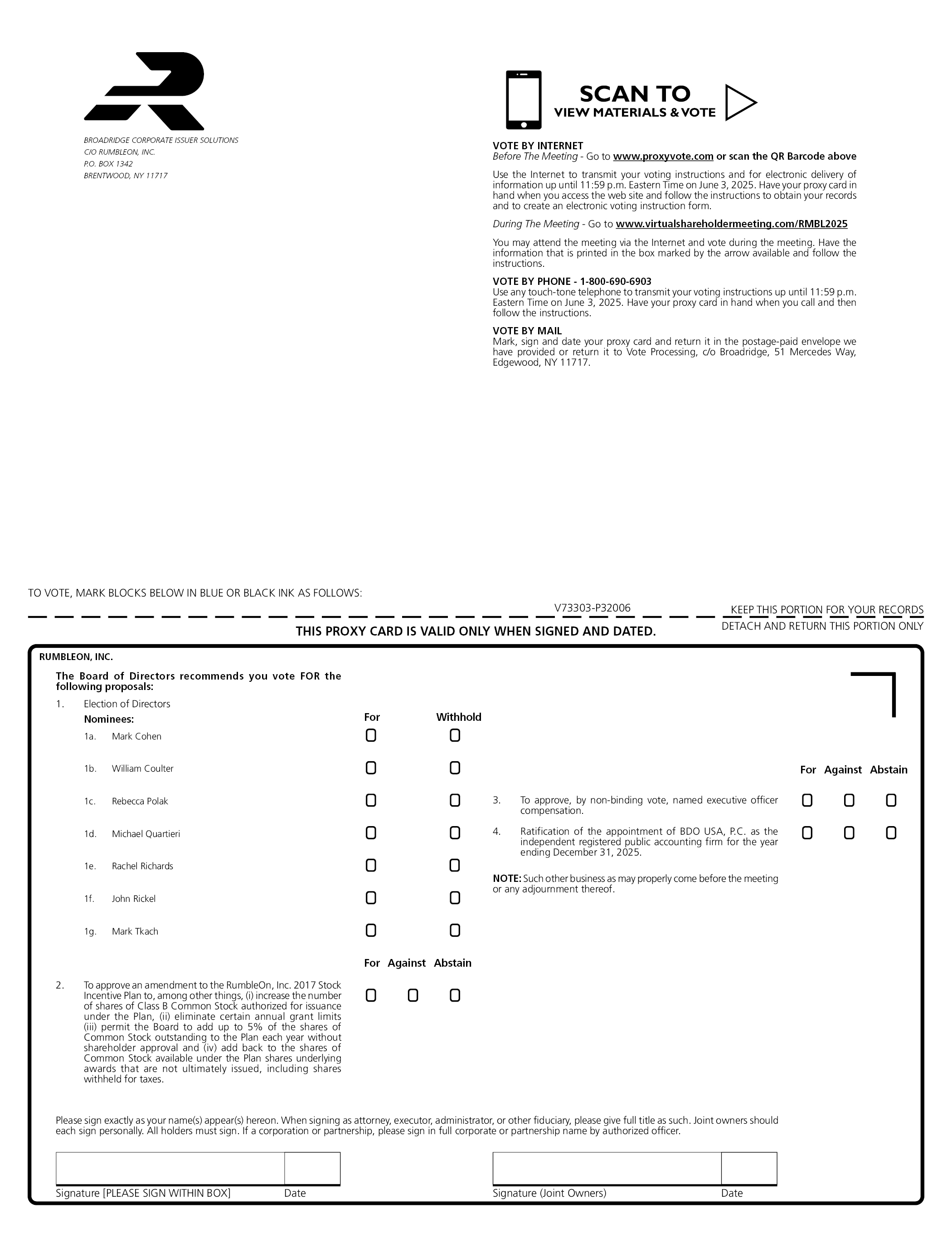 BROADRIDGE CORPORATE ISSUER SOLUTIONS C/O RUMBLEON, INC. P.O. BOX 1342 BRENTWOOD, NY 11717 SCAN TO VIEW MATERIALS & VOTE VOTE BY INTERNET Before The Meeting - Go to www.proxyvote.com or scan the QR Barcode above Use the Internet to transmit your voting instructions and for electronic delivery of information up until 11:59 p.m. Eastern Time on June 3, 2025. Have your proxy card in hand when you access the web site and follow the instructions to obtain your records and to create an electronic voting instruction form. During The Meeting - Go to www.virtualshareholdermeeting.com/RMBL2025 You may attend the meeting via the Internet and vote during the meeting. Have the information that is printed in the box marked by the arrow available and follow the instructions. VOTE BY PHONE - 1-800-690-6903 Use any touch-tone telephone to transmit your voting instructions up until 11:59 p.m. Eastern Time on June 3, 2025. Have your proxy card in hand when you call and then follow the instructions. VOTE BY MAIL Mark, sign and date your proxy card and return it in the postage-paid envelope we have provided or return it to Vote Processing, c/o Broadridge, 51 Mercedes Way, Edgewood, NY 11717. TO VOTE, MARK BLOCKS BELOW IN BLUE OR BLACK INK AS FOLLOWS: V73303-P32006 KEEP THIS PORTION FOR YOUR RECORDS THIS PROXY CARD IS VALID ONLY WHEN SIGNED AND DATED. DETACH AND RETURN THIS PORTION ONLY RUMBLEON, INC. The Board of Directors recommends you vote FOR the following proposals: 1. Election of Directors Nominees: Mark Cohen William Coulter Rebecca Polak Michael Quartieri Rachel Richards John Rickel Mark Tkach 2. To approve an amendment to the RumbleOn, Inc. 2017 Stock Incentive Plan to, among other things,(i) increase the number of shares of Class B Common Stock authorized for issuance under the Plan, (ii) eliminate certain annual grant limits (iii) permit the Board to add up to 5% of the shares of Common Stock outstanding to the Plan each year without shareholder approval and (iv) add back to the shares of Common Stock available under the Plan shares underlying awards that are not ultimately issued, including shares withheld for taxes. Please sign exactly as your name(s) appear(s) hereon. When signing as attorney, executor, administrator, or other fiduciary, please give full title as such. Joint owners should each sign personally. All holders must sign. If a corporation or partnership, please sign in full corporate or partnership name by authorized officer. 4. Ratification of the appointment of BDO USA, P.C. as the independent registered public accounting firm for the year ending December 31, 2025. 3. To approve, by non-binding vote, named executive officer compensation. NOTE: Such other business as may properly come before the meeting or any adjournment thereof. Signature [PLEASE SIGN WITHIN BOX] Date Signature (Joint Owners) Date For Against Abstain
