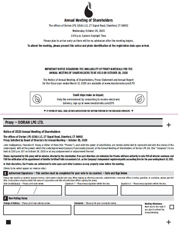 The Annual Report, including the Form 10-K, as amended, and the exhibits filed with it are available at our website at www.dorianlpg.com. Upon request by any shareholder to Investor Relations by email at IR@dorianlpg.com, mail at Dorian LPG Ltd., c/o Dorian LPG (USA) LLC, 27 Signal Road, Stamford, Connecticut
