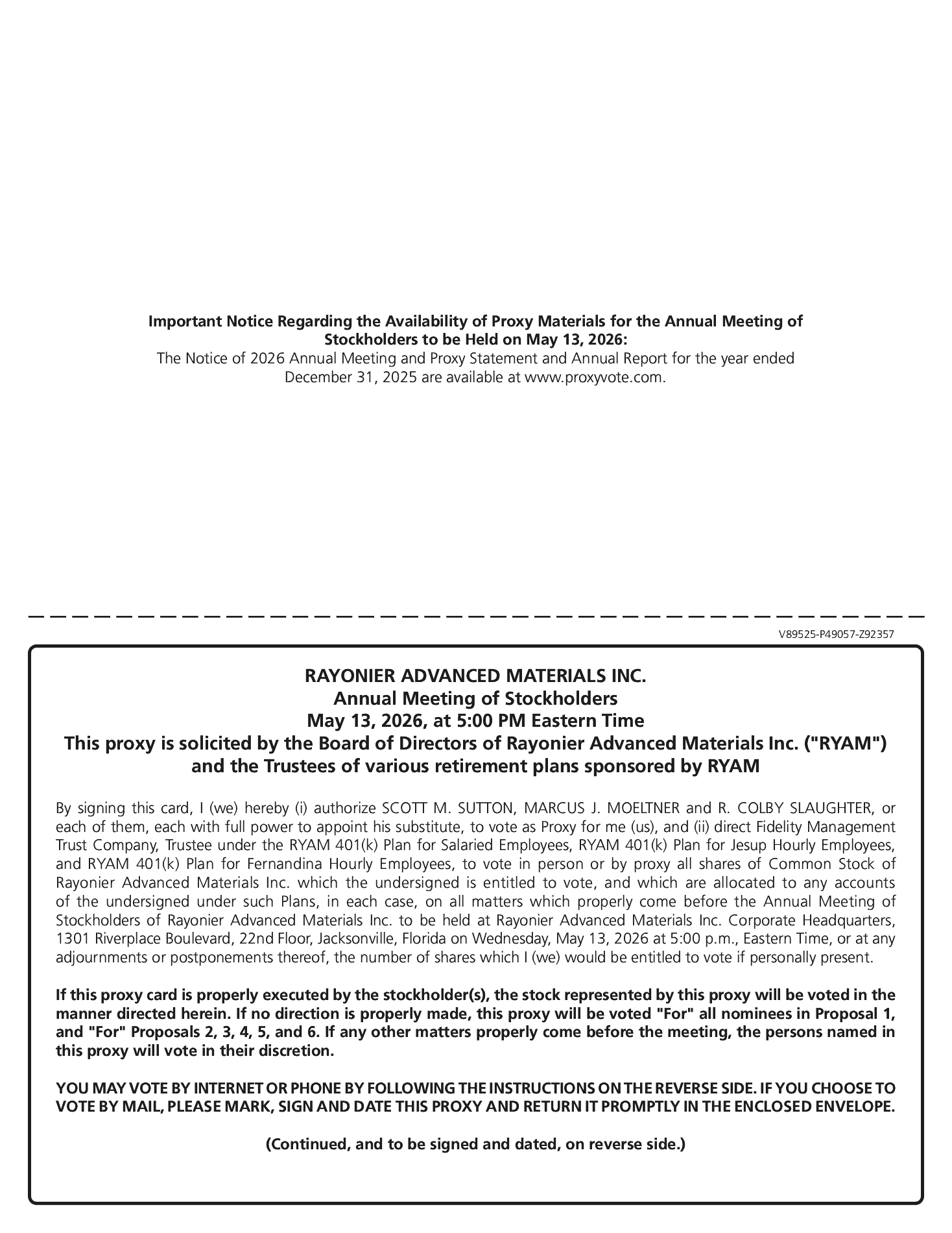 ![]() | Location RYAM Corporate Headquarters 1301 Riverplace Boulevard 22nd Floor Jacksonville, Florida | Admission To attend the Annual Meeting, you will need to bring (1) proof of ownership of Common Stock as of the Record Date and (2) a valid government-issued photo identification. If you do not have proof of ownership together with a valid government-issued photo identification, you will not be admitted to the meeting. | ||||