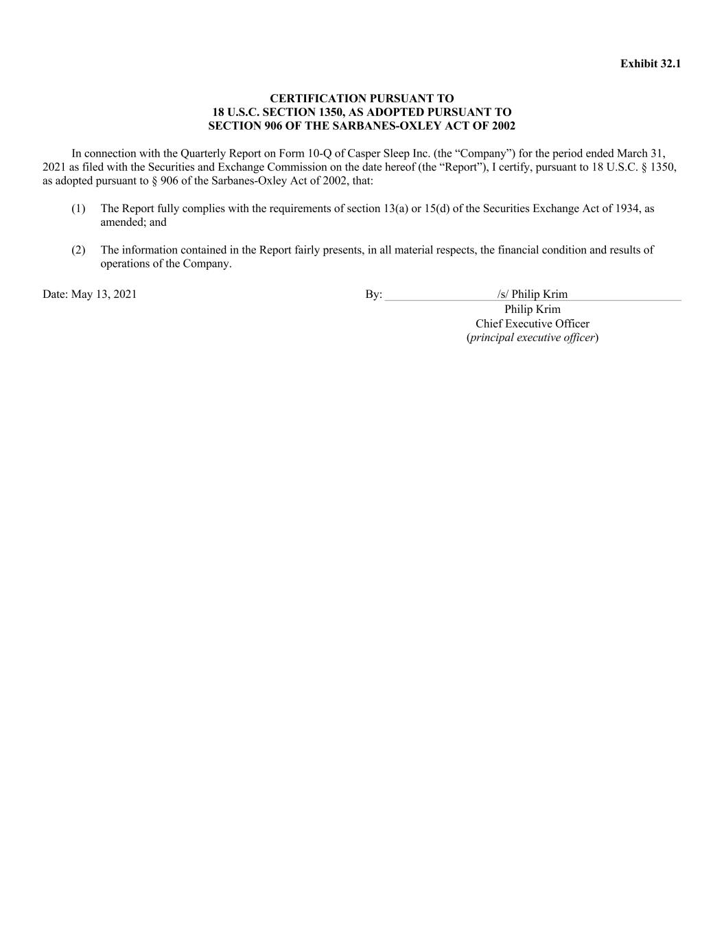 Exhibit 32.1 CERTIFICATION PURSUANT TO 18 U.S.C. SECTION 1350, AS ADOPTED PURSUANT TO SECTION 906 OF THE SARBANES-OXLEY ACT OF 2002 In connection with the Quarterly Report on Form 10-Q of Casper Sleep Inc. (the “Company”) for the period ended March 31, 2021 as filed with the Securities and Exchange Commission on the date hereof (the “Report”), I certify, pursuant to 18 U.S.C. § 1350, as adopted pursuant to § 906 of the Sarbanes-Oxley Act of 2002, that: (1) The Report fully complies with the requirements of section 13(a) or 15(d) of the Securities Exchange Act of 1934, as amended; and (2) The information contained in the Report fairly presents, in all material respects, the financial condition and results of operations of the Company. Date: May 13, 2021 By: /s/ Philip Krim Philip Krim Chief Executive Officer (principal executive officer)
