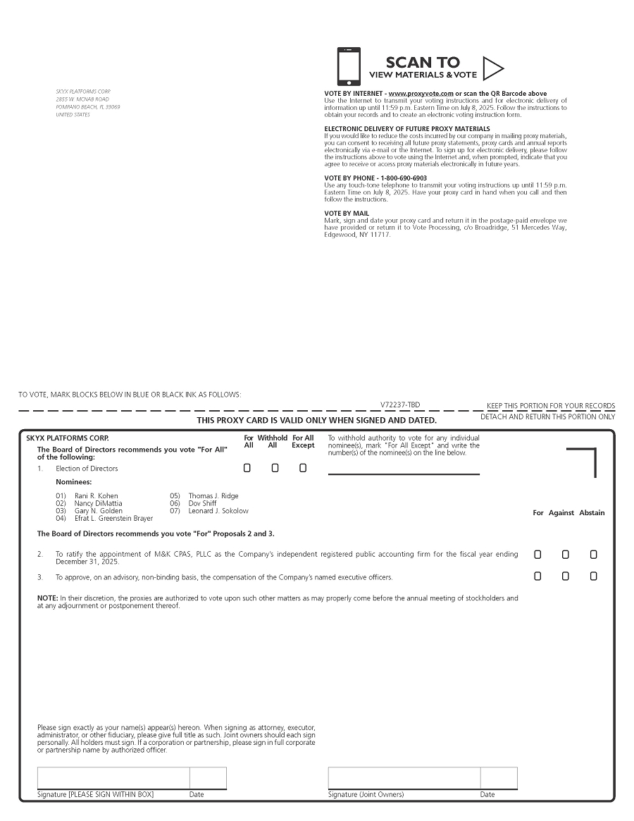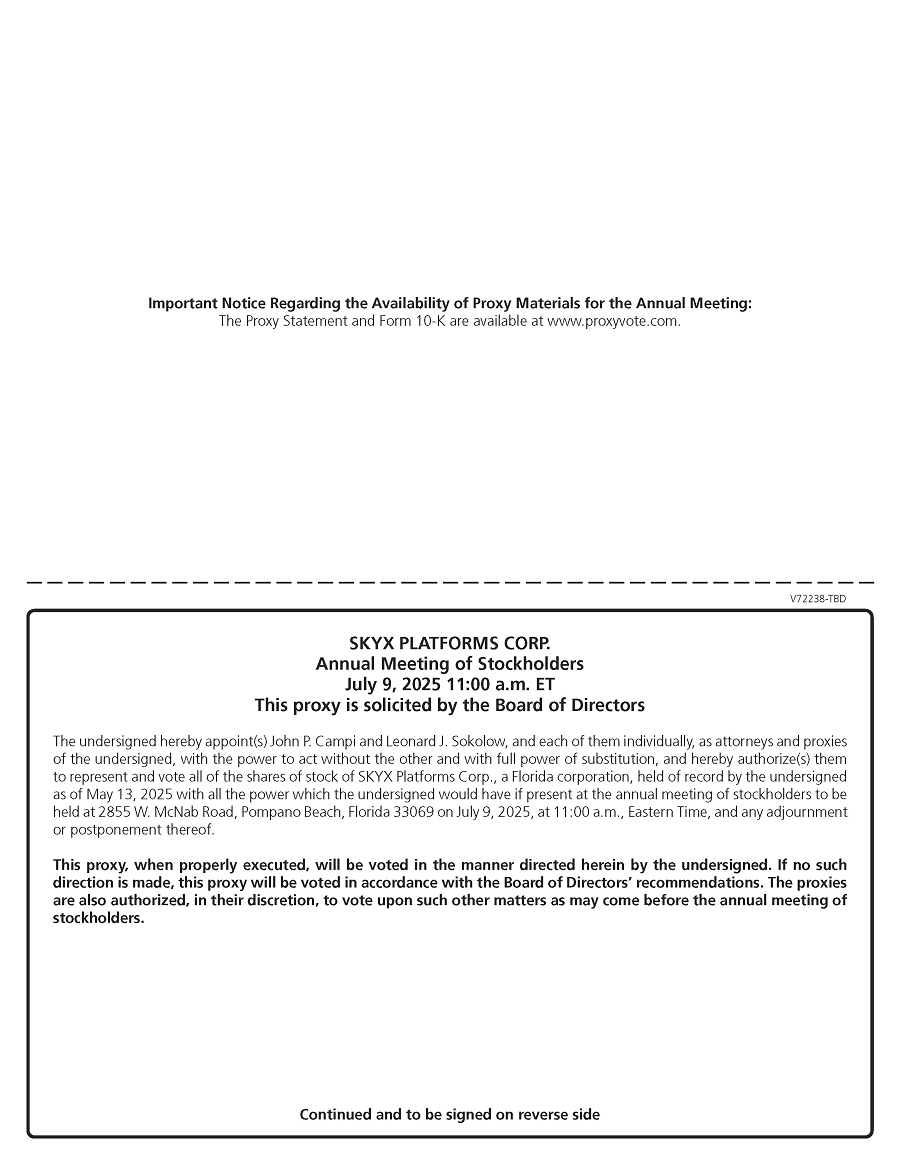 You are invited to attend the Annual Meeting of Stockholders (the “Annual Meeting”) of SKYX Platforms Corp. (the “Company,” “we,” “us” or “our”) to be held on July 9, 2025 beginning at 11:00 a.m. Eastern Time, at 2855 W. McNab Road, Pompano Beach, Florida 33069, for the following purposes:
