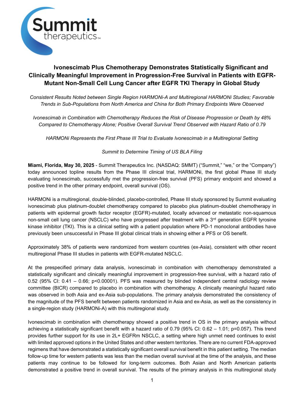 1 Ivonescimab Plus Chemotherapy Demonstrates Statistically Significant and Clinically Meaningful Improvement in Progression-Free Survival in Patients with EGFR- Mutant Non-Small Cell Lung Cancer after EGFR TKI Therapy in Global Study Consistent Results Noted between Single Region HARMONi-A and Multiregional HARMONi Studies; Favorable Trends in Sub-Populations from North America and China for Both Primary Endpoints Were Observed Ivonescimab in Combination with Chemotherapy Reduces the Risk of Disease Progression or Death by 48% Compared to Chemotherapy Alone; Positive Overall Survival Trend Observed with Hazard Ratio of 0.79 HARMONi Represents the First Phase III Trial to Evaluate Ivonescimab in a Multiregional Setting Summit to Determine Timing of US BLA Filing Miami, Florida, May 30, 2025 - Summit Therapeutics Inc. (NASDAQ: SMMT) (“Summit,” “we,” or the “Company”) today announced topline results from the Phase III clinical trial, HARMONi, the first global Phase III study evaluating ivonescimab, successfully met the progression-free survival (PFS) primary endpoint and showed a positive trend in the other primary endpoint, overall survival (OS). HARMONi is a multiregional, double-blinded, placebo-controlled, Phase III study sponsored by Summit evaluating ivonescimab plus platinum-doublet chemotherapy compared to placebo plus platinum-doublet chemotherapy in patients with epidermal growth factor receptor (EGFR)-mutated, locally advanced or metastatic non-squamous non-small cell lung cancer (NSCLC) who have progressed after treatment with a 3rd generation EGFR tyrosine kinase inhibitor (TKI). This is a clinical setting with a patient population where PD-1 monoclonal antibodies have previously been unsuccessful in Phase III global clinical trials in showing either a PFS or OS benefit. Approximately 38% of patients were randomized from western countries (ex-Asia), consistent with other recent multiregional Phase III studies in patients with EGFR-mutated NSCLC. At the prespecified primary data analysis, ivonescimab in combination with chemotherapy demonstrated a statistically significant and clinically meaningful improvement in progression-free survival, with a hazard ratio of 0.52 (95% CI: 0.41 – 0.66; p<0.00001). PFS was measured by blinded independent central radiology review committee (BICR) compared to placebo in combination with chemotherapy. A clinically meaningful hazard ratio was observed in both Asia and ex-Asia sub-populations. The primary analysis demonstrated the consistency of the magnitude of the PFS benefit between patients randomized in Asia and ex-Asia, as well as the consistency in a single-region study (HARMONi-A) with this multiregional study. Ivonescimab in combination with chemotherapy showed a positive trend in OS in the primary analysis without achieving a statistically significant benefit with a hazard ratio of 0.79 (95% CI: 0.62 – 1.01; p=0.057). This trend provides further support for its use in 2L+ EGFRm NSCLC, a setting where high unmet need continues to exist with limited approved options in the United States and other western territories. There are no current FDA-approved regimens that have demonstrated a statistically significant overall survival benefit in this patient setting. The median follow-up time for western patients was less than the median overall survival at the time of the analysis, and these patients may continue to be followed for long-term outcomes. Both Asian and North American patients demonstrated a positive trend in overall survival. The results of the primary analysis in this multiregional study