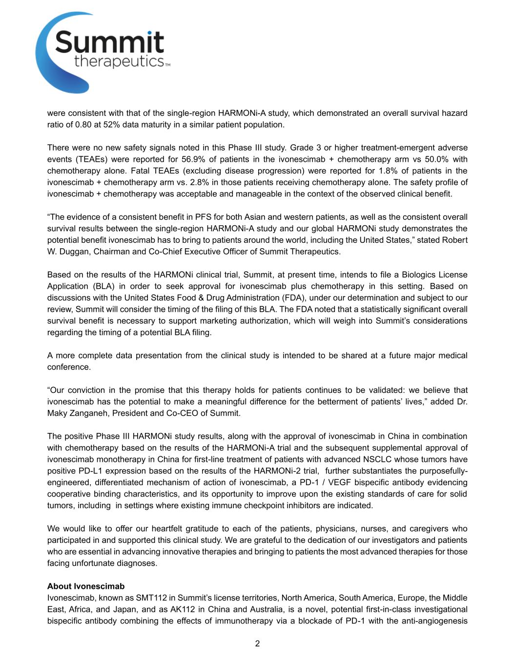 2 were consistent with that of the single-region HARMONi-A study, which demonstrated an overall survival hazard ratio of 0.80 at 52% data maturity in a similar patient population. There were no new safety signals noted in this Phase III study. Grade 3 or higher treatment-emergent adverse events (TEAEs) were reported for 56.9% of patients in the ivonescimab + chemotherapy arm vs 50.0% with chemotherapy alone. Fatal TEAEs (excluding disease progression) were reported for 1.8% of patients in the ivonescimab + chemotherapy arm vs. 2.8% in those patients receiving chemotherapy alone. The safety profile of ivonescimab + chemotherapy was acceptable and manageable in the context of the observed clinical benefit. “The evidence of a consistent benefit in PFS for both Asian and western patients, as well as the consistent overall survival results between the single-region HARMONi-A study and our global HARMONi study demonstrates the potential benefit ivonescimab has to bring to patients around the world, including the United States,” stated Robert W. Duggan, Chairman and Co-Chief Executive Officer of Summit Therapeutics. Based on the results of the HARMONi clinical trial, Summit, at present time, intends to file a Biologics License Application (BLA) in order to seek approval for ivonescimab plus chemotherapy in this setting. Based on discussions with the United States Food & Drug Administration (FDA), under our determination and subject to our review, Summit will consider the timing of the filing of this BLA. The FDA noted that a statistically significant overall survival benefit is necessary to support marketing authorization, which will weigh into Summit’s considerations regarding the timing of a potential BLA filing. A more complete data presentation from the clinical study is intended to be shared at a future major medical conference. “Our conviction in the promise that this therapy holds for patients continues to be validated: we believe that ivonescimab has the potential to make a meaningful difference for the betterment of patients’ lives,” added Dr. Maky Zanganeh, President and Co-CEO of Summit. The positive Phase III HARMONi study results, along with the approval of ivonescimab in China in combination with chemotherapy based on the results of the HARMONi-A trial and the subsequent supplemental approval of ivonescimab monotherapy in China for first-line treatment of patients with advanced NSCLC whose tumors have positive PD-L1 expression based on the results of the HARMONi-2 trial, further substantiates the purposefully- engineered, differentiated mechanism of action of ivonescimab, a PD-1 / VEGF bispecific antibody evidencing cooperative binding characteristics, and its opportunity to improve upon the existing standards of care for solid tumors, including in settings where existing immune checkpoint inhibitors are indicated. We would like to offer our heartfelt gratitude to each of the patients, physicians, nurses, and caregivers who participated in and supported this clinical study. We are grateful to the dedication of our investigators and patients who are essential in advancing innovative therapies and bringing to patients the most advanced therapies for those facing unfortunate diagnoses. About Ivonescimab Ivonescimab, known as SMT112 in Summit’s license territories, North America, South America, Europe, the Middle East, Africa, and Japan, and as AK112 in China and Australia, is a novel, potential first-in-class investigational bispecific antibody combining the effects of immunotherapy via a blockade of PD-1 with the anti-angiogenesis