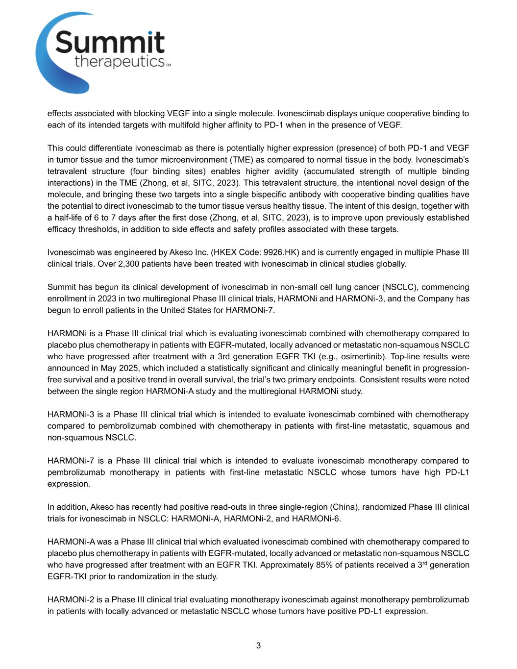 3 effects associated with blocking VEGF into a single molecule. Ivonescimab displays unique cooperative binding to each of its intended targets with multifold higher affinity to PD-1 when in the presence of VEGF. This could differentiate ivonescimab as there is potentially higher expression (presence) of both PD-1 and VEGF in tumor tissue and the tumor microenvironment (TME) as compared to normal tissue in the body. Ivonescimab’s tetravalent structure (four binding sites) enables higher avidity (accumulated strength of multiple binding interactions) in the TME (Zhong, et al, SITC, 2023). This tetravalent structure, the intentional novel design of the molecule, and bringing these two targets into a single bispecific antibody with cooperative binding qualities have the potential to direct ivonescimab to the tumor tissue versus healthy tissue. The intent of this design, together with a half-life of 6 to 7 days after the first dose (Zhong, et al, SITC, 2023), is to improve upon previously established efficacy thresholds, in addition to side effects and safety profiles associated with these targets. Ivonescimab was engineered by Akeso Inc. (HKEX Code: 9926.HK) and is currently engaged in multiple Phase III clinical trials. Over 2,300 patients have been treated with ivonescimab in clinical studies globally. Summit has begun its clinical development of ivonescimab in non-small cell lung cancer (NSCLC), commencing enrollment in 2023 in two multiregional Phase III clinical trials, HARMONi and HARMONi-3, and the Company has begun to enroll patients in the United States for HARMONi-7. HARMONi is a Phase III clinical trial which is evaluating ivonescimab combined with chemotherapy compared to placebo plus chemotherapy in patients with EGFR-mutated, locally advanced or metastatic non-squamous NSCLC who have progressed after treatment with a 3rd generation EGFR TKI (e.g., osimertinib). Top-line results were announced in May 2025, which included a statistically significant and clinically meaningful benefit in progression- free survival and a positive trend in overall survival, the trial’s two primary endpoints. Consistent results were noted between the single region HARMONi-A study and the multiregional HARMONi study. HARMONi-3 is a Phase III clinical trial which is intended to evaluate ivonescimab combined with chemotherapy compared to pembrolizumab combined with chemotherapy in patients with first-line metastatic, squamous and non-squamous NSCLC. HARMONi-7 is a Phase III clinical trial which is intended to evaluate ivonescimab monotherapy compared to pembrolizumab monotherapy in patients with first-line metastatic NSCLC whose tumors have high PD-L1 expression. In addition, Akeso has recently had positive read-outs in three single-region (China), randomized Phase III clinical trials for ivonescimab in NSCLC: HARMONi-A, HARMONi-2, and HARMONi-6. HARMONi-A was a Phase III clinical trial which evaluated ivonescimab combined with chemotherapy compared to placebo plus chemotherapy in patients with EGFR-mutated, locally advanced or metastatic non-squamous NSCLC who have progressed after treatment with an EGFR TKI. Approximately 85% of patients received a 3rd generation EGFR-TKI prior to randomization in the study. HARMONi-2 is a Phase III clinical trial evaluating monotherapy ivonescimab against monotherapy pembrolizumab in patients with locally advanced or metastatic NSCLC whose tumors have positive PD-L1 expression.