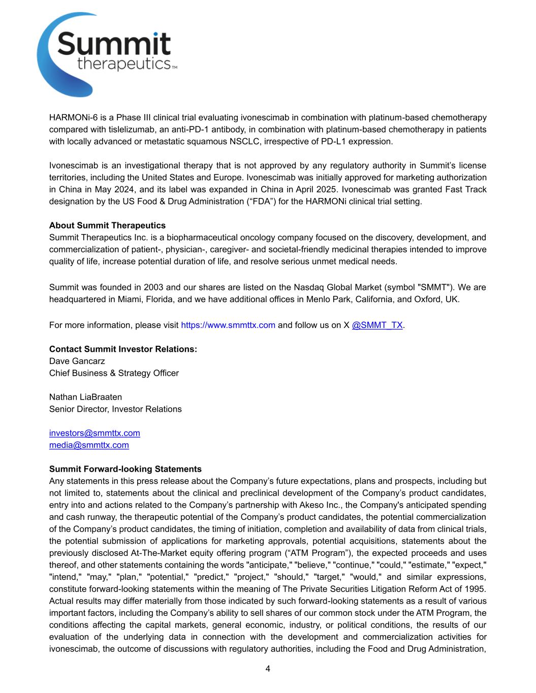 4 HARMONi-6 is a Phase III clinical trial evaluating ivonescimab in combination with platinum-based chemotherapy compared with tislelizumab, an anti-PD-1 antibody, in combination with platinum-based chemotherapy in patients with locally advanced or metastatic squamous NSCLC, irrespective of PD-L1 expression. Ivonescimab is an investigational therapy that is not approved by any regulatory authority in Summit’s license territories, including the United States and Europe. Ivonescimab was initially approved for marketing authorization in China in May 2024, and its label was expanded in China in April 2025. Ivonescimab was granted Fast Track designation by the US Food & Drug Administration (“FDA”) for the HARMONi clinical trial setting. About Summit Therapeutics Summit Therapeutics Inc. is a biopharmaceutical oncology company focused on the discovery, development, and commercialization of patient-, physician-, caregiver- and societal-friendly medicinal therapies intended to improve quality of life, increase potential duration of life, and resolve serious unmet medical needs. Summit was founded in 2003 and our shares are listed on the Nasdaq Global Market (symbol "SMMT"). We are headquartered in Miami, Florida, and we have additional offices in Menlo Park, California, and Oxford, UK. For more information, please visit https://www.smmttx.com and follow us on X @SMMT_TX. Contact Summit Investor Relations: Dave Gancarz Chief Business & Strategy Officer Nathan LiaBraaten Senior Director, Investor Relations investors@smmttx.com media@smmttx.com Summit Forward-looking Statements Any statements in this press release about the Company’s future expectations, plans and prospects, including but not limited to, statements about the clinical and preclinical development of the Company’s product candidates, entry into and actions related to the Company’s partnership with Akeso Inc., the Company's anticipated spending and cash runway, the therapeutic potential of the Company’s product candidates, the potential commercialization of the Company’s product candidates, the timing of initiation, completion and availability of data from clinical trials, the potential submission of applications for marketing approvals, potential acquisitions, statements about the previously disclosed At-The-Market equity offering program (“ATM Program”), the expected proceeds and uses thereof, and other statements containing the words "anticipate," "believe," "continue," "could," "estimate," "expect," "intend," "may," "plan," "potential," "predict," "project," "should," "target," "would," and similar expressions, constitute forward-looking statements within the meaning of The Private Securities Litigation Reform Act of 1995. Actual results may differ materially from those indicated by such forward-looking statements as a result of various important factors, including the Company’s ability to sell shares of our common stock under the ATM Program, the conditions affecting the capital markets, general economic, industry, or political conditions, the results of our evaluation of the underlying data in connection with the development and commercialization activities for ivonescimab, the outcome of discussions with regulatory authorities, including the Food and Drug Administration,