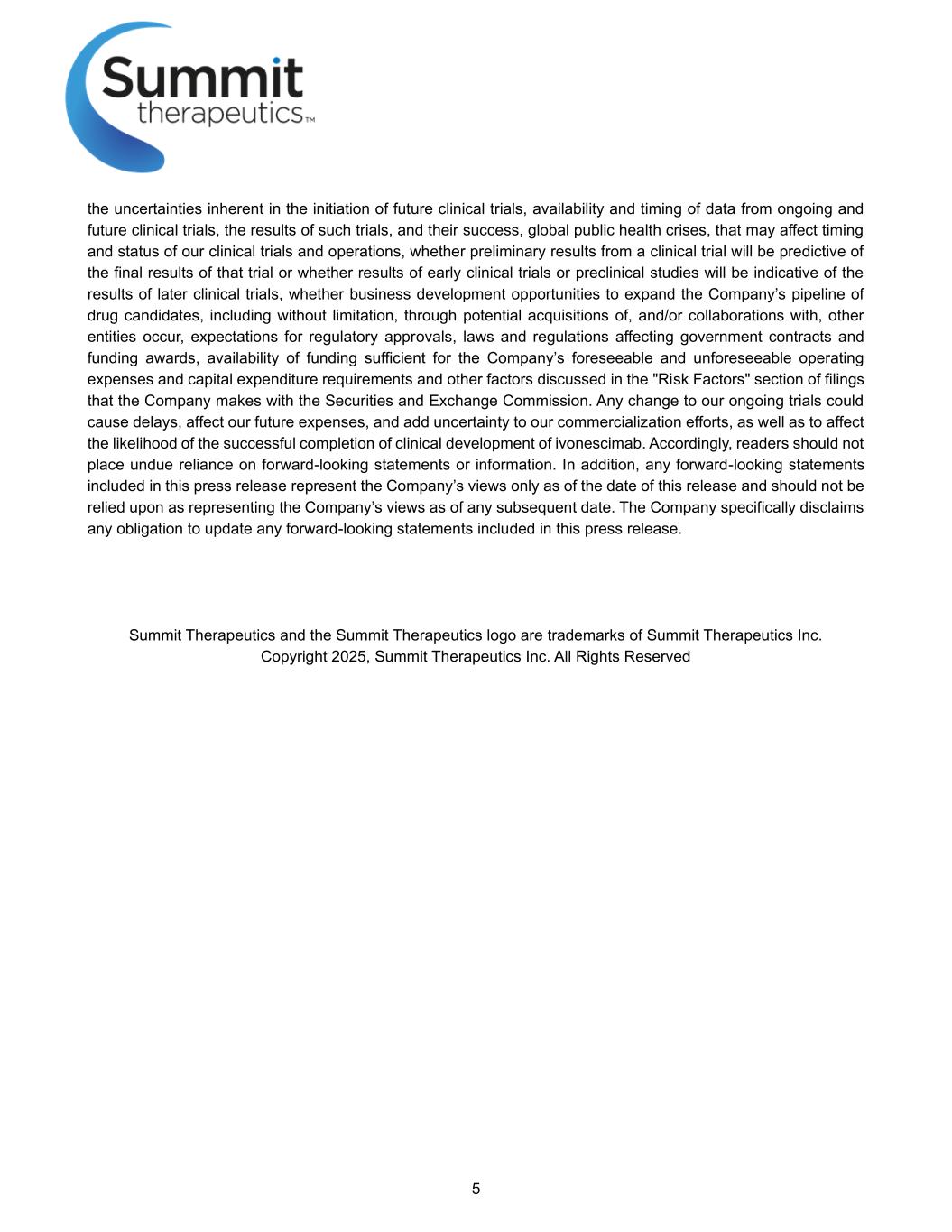 5 the uncertainties inherent in the initiation of future clinical trials, availability and timing of data from ongoing and future clinical trials, the results of such trials, and their success, global public health crises, that may affect timing and status of our clinical trials and operations, whether preliminary results from a clinical trial will be predictive of the final results of that trial or whether results of early clinical trials or preclinical studies will be indicative of the results of later clinical trials, whether business development opportunities to expand the Company’s pipeline of drug candidates, including without limitation, through potential acquisitions of, and/or collaborations with, other entities occur, expectations for regulatory approvals, laws and regulations affecting government contracts and funding awards, availability of funding sufficient for the Company’s foreseeable and unforeseeable operating expenses and capital expenditure requirements and other factors discussed in the "Risk Factors" section of filings that the Company makes with the Securities and Exchange Commission. Any change to our ongoing trials could cause delays, affect our future expenses, and add uncertainty to our commercialization efforts, as well as to affect the likelihood of the successful completion of clinical development of ivonescimab. Accordingly, readers should not place undue reliance on forward-looking statements or information. In addition, any forward-looking statements included in this press release represent the Company’s views only as of the date of this release and should not be relied upon as representing the Company’s views as of any subsequent date. The Company specifically disclaims any obligation to update any forward-looking statements included in this press release. Summit Therapeutics and the Summit Therapeutics logo are trademarks of Summit Therapeutics Inc. Copyright 2025, Summit Therapeutics Inc. All Rights Reserved