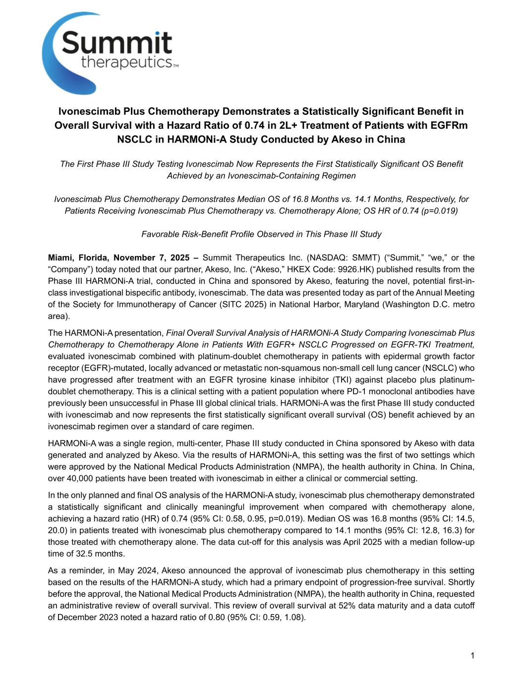 1 Ivonescimab Plus Chemotherapy Demonstrates a Statistically Significant Benefit in Overall Survival with a Hazard Ratio of 0.74 in 2L+ Treatment of Patients with EGFRm NSCLC in HARMONi-A Study Conducted by Akeso in China The First Phase III Study Testing Ivonescimab Now Represents the First Statistically Significant OS Benefit Achieved by an Ivonescimab-Containing Regimen Ivonescimab Plus Chemotherapy Demonstrates Median OS of 16.8 Months vs. 14.1 Months, Respectively, for Patients Receiving Ivonescimab Plus Chemotherapy vs. Chemotherapy Alone; OS HR of 0.74 (p=0.019) Favorable Risk-Benefit Profile Observed in This Phase III Study Miami, Florida, November 7, 2025 – Summit Therapeutics Inc. (NASDAQ: SMMT) (“Summit,” “we,” or the “Company”) today noted that our partner, Akeso, Inc. (“Akeso,” HKEX Code: 9926.HK) published results from the Phase III HARMONi-A trial, conducted in China and sponsored by Akeso, featuring the novel, potential first-in- class investigational bispecific antibody, ivonescimab. The data was presented today as part of the Annual Meeting of the Society for Immunotherapy of Cancer (SITC 2025) in National Harbor, Maryland (Washington D.C. metro area). The HARMONi-A presentation, Final Overall Survival Analysis of HARMONi-A Study Comparing Ivonescimab Plus Chemotherapy to Chemotherapy Alone in Patients With EGFR+ NSCLC Progressed on EGFR-TKI Treatment, evaluated ivonescimab combined with platinum-doublet chemotherapy in patients with epidermal growth factor receptor (EGFR)-mutated, locally advanced or metastatic non-squamous non-small cell lung cancer (NSCLC) who have progressed after treatment with an EGFR tyrosine kinase inhibitor (TKI) against placebo plus platinum- doublet chemotherapy. This is a clinical setting with a patient population where PD-1 monoclonal antibodies have previously been unsuccessful in Phase III global clinical trials. HARMONi-A was the first Phase III study conducted with ivonescimab and now represents the first statistically significant overall survival (OS) benefit achieved by an ivonescimab regimen over a standard of care regimen. HARMONi-A was a single region, multi-center, Phase III study conducted in China sponsored by Akeso with data generated and analyzed by Akeso. Via the results of HARMONi-A, this setting was the first of two settings which were approved by the National Medical Products Administration (NMPA), the health authority in China. In China, over 40,000 patients have been treated with ivonescimab in either a clinical or commercial setting. In the only planned and final OS analysis of the HARMONi-A study, ivonescimab plus chemotherapy demonstrated a statistically significant and clinically meaningful improvement when compared with chemotherapy alone, achieving a hazard ratio (HR) of 0.74 (95% CI: 0.58, 0.95, p=0.019). Median OS was 16.8 months (95% CI: 14.5, 20.0) in patients treated with ivonescimab plus chemotherapy compared to 14.1 months (95% CI: 12.8, 16.3) for those treated with chemotherapy alone. The data cut-off for this analysis was April 2025 with a median follow-up time of 32.5 months. As a reminder, in May 2024, Akeso announced the approval of ivonescimab plus chemotherapy in this setting based on the results of the HARMONi-A study, which had a primary endpoint of progression-free survival. Shortly before the approval, the National Medical Products Administration (NMPA), the health authority in China, requested an administrative review of overall survival. This review of overall survival at 52% data maturity and a data cutoff of December 2023 noted a hazard ratio of 0.80 (95% CI: 0.59, 1.08).
