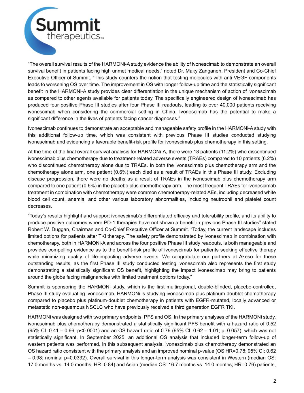 2 “The overall survival results of the HARMONi-A study evidence the ability of ivonescimab to demonstrate an overall survival benefit in patients facing high unmet medical needs,” noted Dr. Maky Zanganeh, President and Co-Chief Executive Officer of Summit. “This study counters the notion that testing molecules with anti-VEGF components leads to worsening OS over time. The improvement in OS with longer follow-up time and the statistically significant benefit in the HARMONi-A study provides clear differentiation in the unique mechanism of action of ivonescimab as compared to other agents available for patients today. The specifically engineered design of ivonescimab has produced four positive Phase III studies after four Phase III readouts, leading to over 40,000 patients receiving ivonescimab when considering the commercial setting in China. Ivonescimab has the potential to make a significant difference in the lives of patients facing cancer diagnoses.” Ivonescimab continues to demonstrate an acceptable and manageable safety profile in the HARMONi-A study with this additional follow-up time, which was consistent with previous Phase III studies conducted studying ivonescimab and evidencing a favorable benefit-risk profile for ivonescimab plus chemotherapy in this setting. At the time of the final overall survival analysis for HARMONi-A, there were 18 patients (11.2%) who discontinued ivonescimab plus chemotherapy due to treatment-related adverse events (TRAEs) compared to 10 patients (6.2%) who discontinued chemotherapy alone due to TRAEs. In both the ivonescimab plus chemotherapy arm and the chemotherapy alone arm, one patient (0.6%) each died as a result of TRAEs in this Phase III study. Excluding disease progression, there were no deaths as a result of TRAEs in the ivonescimab plus chemotherapy arm compared to one patient (0.6%) in the placebo plus chemotherapy arm. The most frequent TRAEs for ivonescimab treatment in combination with chemotherapy were common chemotherapy-related AEs, including decreased white blood cell count, anemia, and other various laboratory abnormalities, including neutrophil and platelet count decreases. “Today’s results highlight and support ivonescimab’s differentiated efficacy and tolerability profile, and its ability to produce positive outcomes where PD-1 therapies have not shown a benefit in previous Phase III studies” stated Robert W. Duggan, Chairman and Co-Chief Executive Officer at Summit. “Today, the current landscape includes limited options for patients after TKI therapy. The safety profile demonstrated by ivonescimab in combination with chemotherapy, both in HARMONi-A and across the four positive Phase III study readouts, is both manageable and provides compelling evidence as to the benefit-risk profile of ivonescimab for patients seeking effective therapy while minimizing quality of life-impacting adverse events. We congratulate our partners at Akeso for these outstanding results, as the first Phase III study conducted testing ivonescimab also represents the first study demonstrating a statistically significant OS benefit, highlighting the impact ivonescimab may bring to patients around the globe facing malignancies with limited treatment options today.” Summit is sponsoring the HARMONi study, which is the first multiregional, double-blinded, placebo-controlled, Phase III study evaluating ivonescimab. HARMONi is studying ivonescimab plus platinum-doublet chemotherapy compared to placebo plus platinum-doublet chemotherapy in patients with EGFR-mutated, locally advanced or metastatic non-squamous NSCLC who have previously received a third generation EGFR TKI. HARMONi was designed with two primary endpoints, PFS and OS. In the primary analyses of the HARMONi study, ivonescimab plus chemotherapy demonstrated a statistically significant PFS benefit with a hazard ratio of 0.52 (95% CI: 0.41 – 0.66; p<0.0001) and an OS hazard ratio of 0.79 (95% CI: 0.62 – 1.01; p=0.057), which was not statistically significant. In September 2025, an additional OS analysis that included longer-term follow-up of western patients was performed. In this subsequent analysis, ivonescimab plus chemotherapy demonstrated an OS hazard ratio consistent with the primary analysis and an improved nominal p-value (OS HR=0.78; 95% CI: 0.62 – 0.98; nominal p=0.0332). Overall survival in this longer-term analysis was consistent in Western (median OS: 17.0 months vs. 14.0 months; HR=0.84) and Asian (median OS: 16.7 months vs. 14.0 months; HR=0.76) patients,