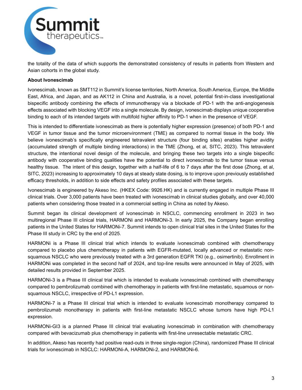 3 the totality of the data of which supports the demonstrated consistency of results in patients from Western and Asian cohorts in the global study. About Ivonescimab Ivonescimab, known as SMT112 in Summit’s license territories, North America, South America, Europe, the Middle East, Africa, and Japan, and as AK112 in China and Australia, is a novel, potential first-in-class investigational bispecific antibody combining the effects of immunotherapy via a blockade of PD-1 with the anti-angiogenesis effects associated with blocking VEGF into a single molecule. By design, ivonescimab displays unique cooperative binding to each of its intended targets with multifold higher affinity to PD-1 when in the presence of VEGF. This is intended to differentiate ivonescimab as there is potentially higher expression (presence) of both PD-1 and VEGF in tumor tissue and the tumor microenvironment (TME) as compared to normal tissue in the body. We believe ivonescimab’s specifically engineered tetravalent structure (four binding sites) enables higher avidity (accumulated strength of multiple binding interactions) in the TME (Zhong, et al, SITC, 2023). This tetravalent structure, the intentional novel design of the molecule, and bringing these two targets into a single bispecific antibody with cooperative binding qualities have the potential to direct ivonescimab to the tumor tissue versus healthy tissue. The intent of this design, together with a half-life of 6 to 7 days after the first dose (Zhong, et al, SITC, 2023) increasing to approximately 10 days at steady state dosing, is to improve upon previously established efficacy thresholds, in addition to side effects and safety profiles associated with these targets. Ivonescimab is engineered by Akeso Inc. (HKEX Code: 9926.HK) and is currently engaged in multiple Phase III clinical trials. Over 3,000 patients have been treated with ivonescimab in clinical studies globally, and over 40,000 patients when considering those treated in a commercial setting in China as noted by Akeso. Summit began its clinical development of ivonescimab in NSCLC, commencing enrollment in 2023 in two multiregional Phase III clinical trials, HARMONi and HARMONi-3. In early 2025, the Company began enrolling patients in the United States for HARMONi-7. Summit intends to open clinical trial sites in the United States for the Phase III study in CRC by the end of 2025. HARMONi is a Phase III clinical trial which intends to evaluate ivonescimab combined with chemotherapy compared to placebo plus chemotherapy in patients with EGFR-mutated, locally advanced or metastatic non- squamous NSCLC who were previously treated with a 3rd generation EGFR TKI (e.g., osimertinib). Enrollment in HARMONi was completed in the second half of 2024, and top-line results were announced in May of 2025, with detailed results provided in September 2025. HARMONi-3 is a Phase III clinical trial which is intended to evaluate ivonescimab combined with chemotherapy compared to pembrolizumab combined with chemotherapy in patients with first-line metastatic, squamous or non- squamous NSCLC, irrespective of PD-L1 expression. HARMONi-7 is a Phase III clinical trial which is intended to evaluate ivonescimab monotherapy compared to pembrolizumab monotherapy in patients with first-line metastatic NSCLC whose tumors have high PD-L1 expression. HARMONi-GI3 is a planned Phase III clinical trial evaluating ivonescimab in combination with chemotherapy compared with bevacizumab plus chemotherapy in patients with first-line unresectable metastatic CRC. In addition, Akeso has recently had positive read-outs in three single-region (China), randomized Phase III clinical trials for ivonescimab in NSCLC: HARMONi-A, HARMONi-2, and HARMONi-6.