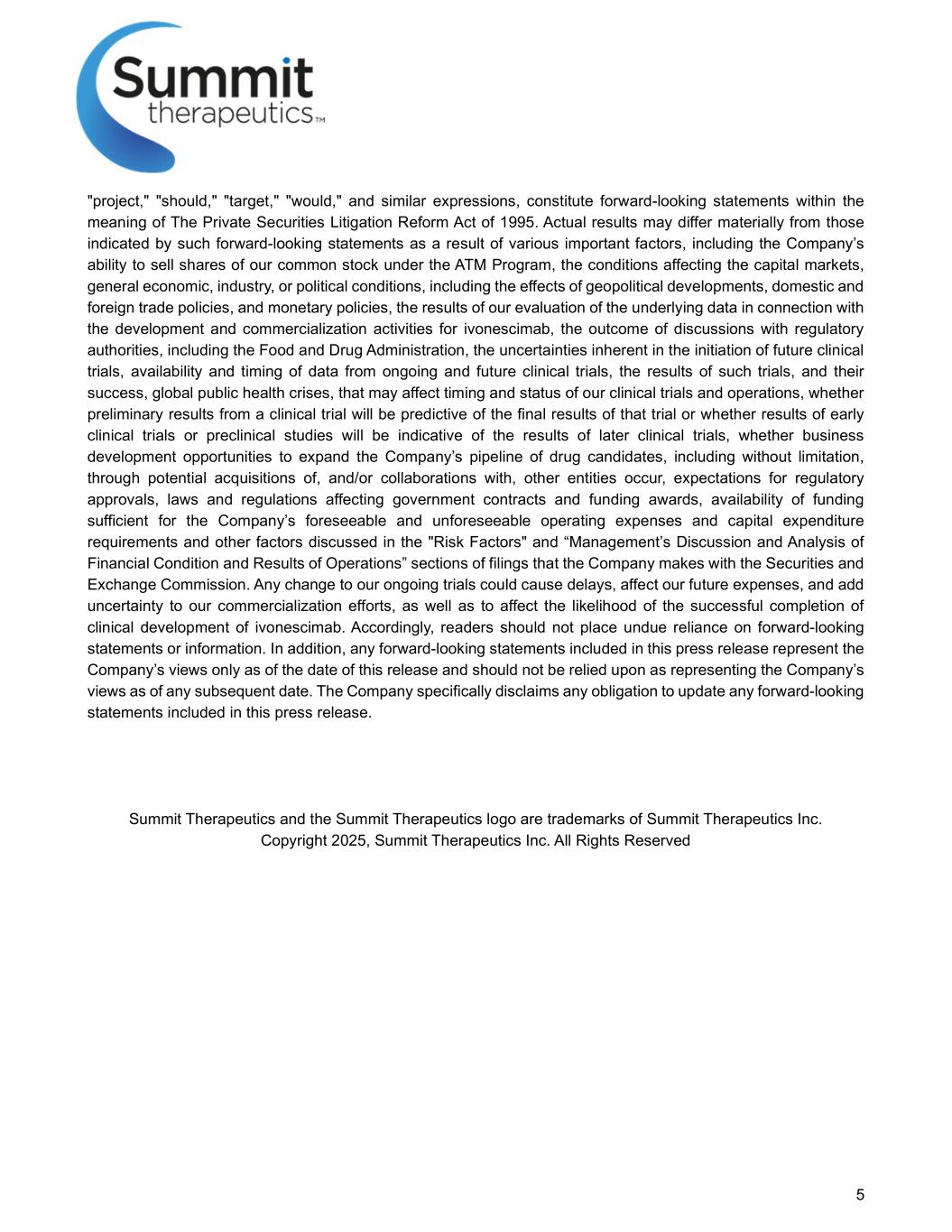 5 "project," "should," "target," "would," and similar expressions, constitute forward-looking statements within the meaning of The Private Securities Litigation Reform Act of 1995. Actual results may differ materially from those indicated by such forward-looking statements as a result of various important factors, including the Company’s ability to sell shares of our common stock under the ATM Program, the conditions affecting the capital markets, general economic, industry, or political conditions, including the effects of geopolitical developments, domestic and foreign trade policies, and monetary policies, the results of our evaluation of the underlying data in connection with the development and commercialization activities for ivonescimab, the outcome of discussions with regulatory authorities, including the Food and Drug Administration, the uncertainties inherent in the initiation of future clinical trials, availability and timing of data from ongoing and future clinical trials, the results of such trials, and their success, global public health crises, that may affect timing and status of our clinical trials and operations, whether preliminary results from a clinical trial will be predictive of the final results of that trial or whether results of early clinical trials or preclinical studies will be indicative of the results of later clinical trials, whether business development opportunities to expand the Company’s pipeline of drug candidates, including without limitation, through potential acquisitions of, and/or collaborations with, other entities occur, expectations for regulatory approvals, laws and regulations affecting government contracts and funding awards, availability of funding sufficient for the Company’s foreseeable and unforeseeable operating expenses and capital expenditure requirements and other factors discussed in the "Risk Factors" and “Management’s Discussion and Analysis of Financial Condition and Results of Operations” sections of filings that the Company makes with the Securities and Exchange Commission. Any change to our ongoing trials could cause delays, affect our future expenses, and add uncertainty to our commercialization efforts, as well as to affect the likelihood of the successful completion of clinical development of ivonescimab. Accordingly, readers should not place undue reliance on forward-looking statements or information. In addition, any forward-looking statements included in this press release represent the Company’s views only as of the date of this release and should not be relied upon as representing the Company’s views as of any subsequent date. The Company specifically disclaims any obligation to update any forward-looking statements included in this press release. Summit Therapeutics and the Summit Therapeutics logo are trademarks of Summit Therapeutics Inc. Copyright 2025, Summit Therapeutics Inc. All Rights Reserved
