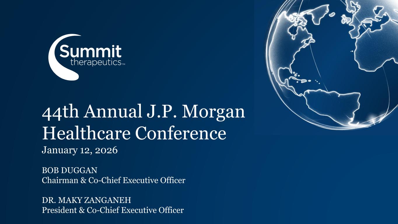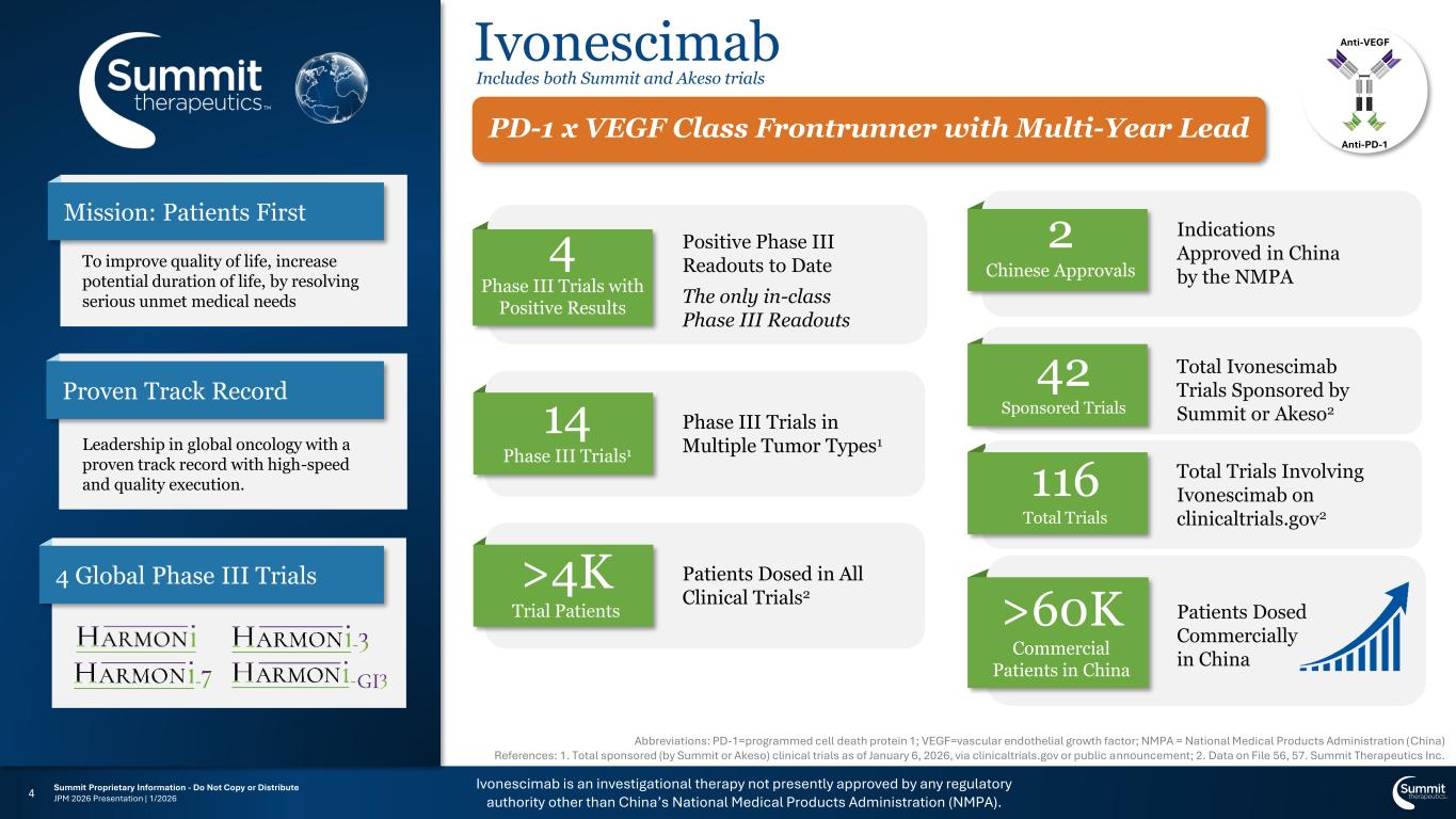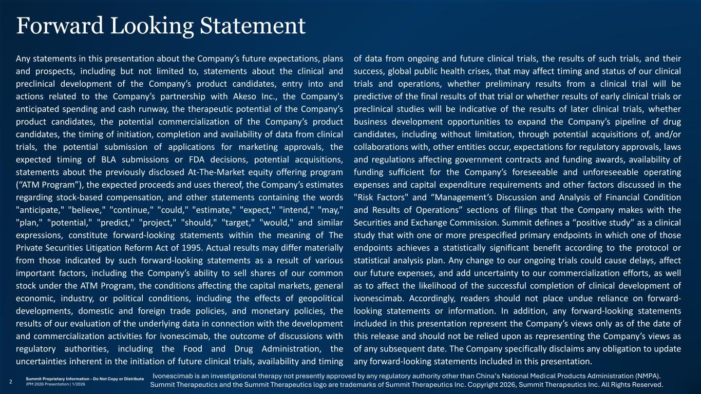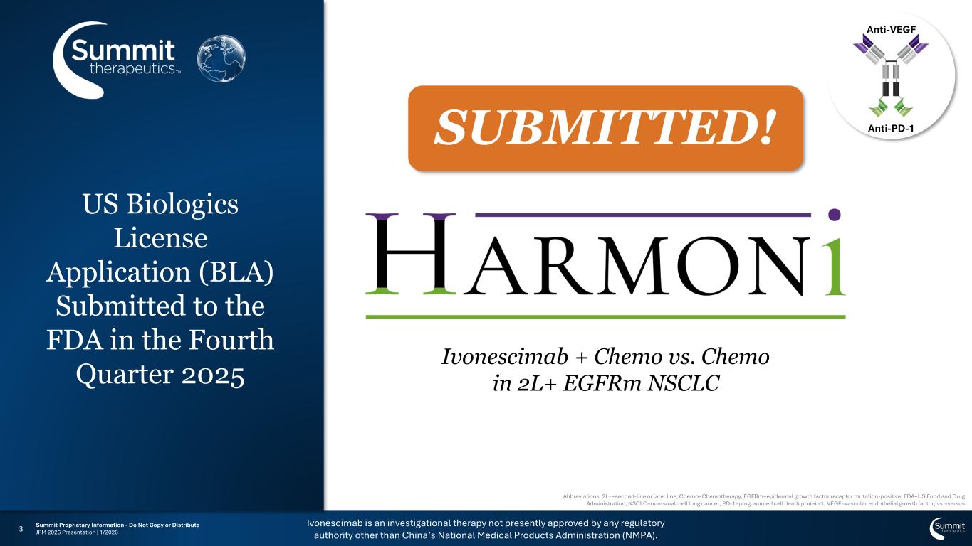 Forward Looking Statement Any statements in this presentation about the Company’s future expectations, plans and prospects, including but not limited to, statements about the clinical and preclinical development of the Company’s product candidates, entry into and actions related to the Company’s partnership with Akeso Inc., the Company's anticipated spending and cash runway, the therapeutic potential of the Company’s product candidates, the potential commercialization of the Company’s product candidates, the timing of initiation, completion and availability of data from clinical trials, the potential submission of applications for marketing approvals, the expected timing of BLA submissions or FDA decisions, potential acquisitions, statements about the previously disclosed At-The-Market equity offering program (“ATM Program”), the expected proceeds and uses thereof, the Company’s estimates regarding stock-based compensation, and other statements containing the words "anticipate," "believe," "continue," "could," "estimate," "expect," "intend," "may," "plan," "potential," "predict," "project," "should," "target," "would," and similar expressions, constitute forward-looking statements within the meaning of The Private Securities Litigation Reform Act of 1995. Actual results may differ materially from those indicated by such forward-looking statements as a result of various important factors, including the Company’s ability to sell shares of our common stock under the ATM Program, the conditions affecting the capital markets, general economic, industry, or political conditions, including the effects of geopolitical developments, domestic and foreign trade policies, and monetary policies, the results of our evaluation of the underlying data in connection with the development and commercialization activities for ivonescimab, the outcome of discussions with regulatory authorities, including the Food and Drug Administration, the uncertainties inherent in the initiation of future clinical trials, availability and timing of data from ongoing and future clinical trials, the results of such trials, and their success, global public health crises, that may affect timing and status of our clinical trials and operations, whether preliminary results from a clinical trial will be predictive of the final results of that trial or whether results of early clinical trials or preclinical studies will be indicative of the results of later clinical trials, whether business development opportunities to expand the Company’s pipeline of drug candidates, including without limitation, through potential acquisitions of, and/or collaborations with, other entities occur, expectations for regulatory approvals, laws and regulations affecting government contracts and funding awards, availability of funding sufficient for the Company’s foreseeable and unforeseeable operating expenses and capital expenditure requirements and other factors discussed in the "Risk Factors" and “Management’s Discussion and Analysis of Financial Condition and Results of Operations” sections of filings that the Company makes with the Securities and Exchange Commission. Summit defines a “positive study” as a clinical study that with one or more prespecified primary endpoints in which one of those endpoints achieves a statistically significant benefit according to the protocol or statistical analysis plan. Any change to our ongoing trials could cause delays, affect our future expenses, and add uncertainty to our commercialization efforts, as well as to affect the likelihood of the successful completion of clinical development of ivonescimab. Accordingly, readers should not place undue reliance on forward- looking statements or information. In addition, any forward-looking statements included in this presentation represent the Company’s views only as of the date of this release and should not be relied upon as representing the Company’s views as of any subsequent date. The Company specifically disclaims any obligation to update any forward-looking statements included in this presentation. Ivonescimab is an investigational therapy not presently approved by any regulatory authority other than China’s National Medical Products Administration (NMPA). Summit Therapeutics and the Summit Therapeutics logo are trademarks of Summit Therapeutics Inc. Copyright 2026, Summit Therapeutics Inc. All Rights Reserved.2 Summit Proprietary Information - Do Not Copy or Distribute JPM 2026 Presentation | 1/2026