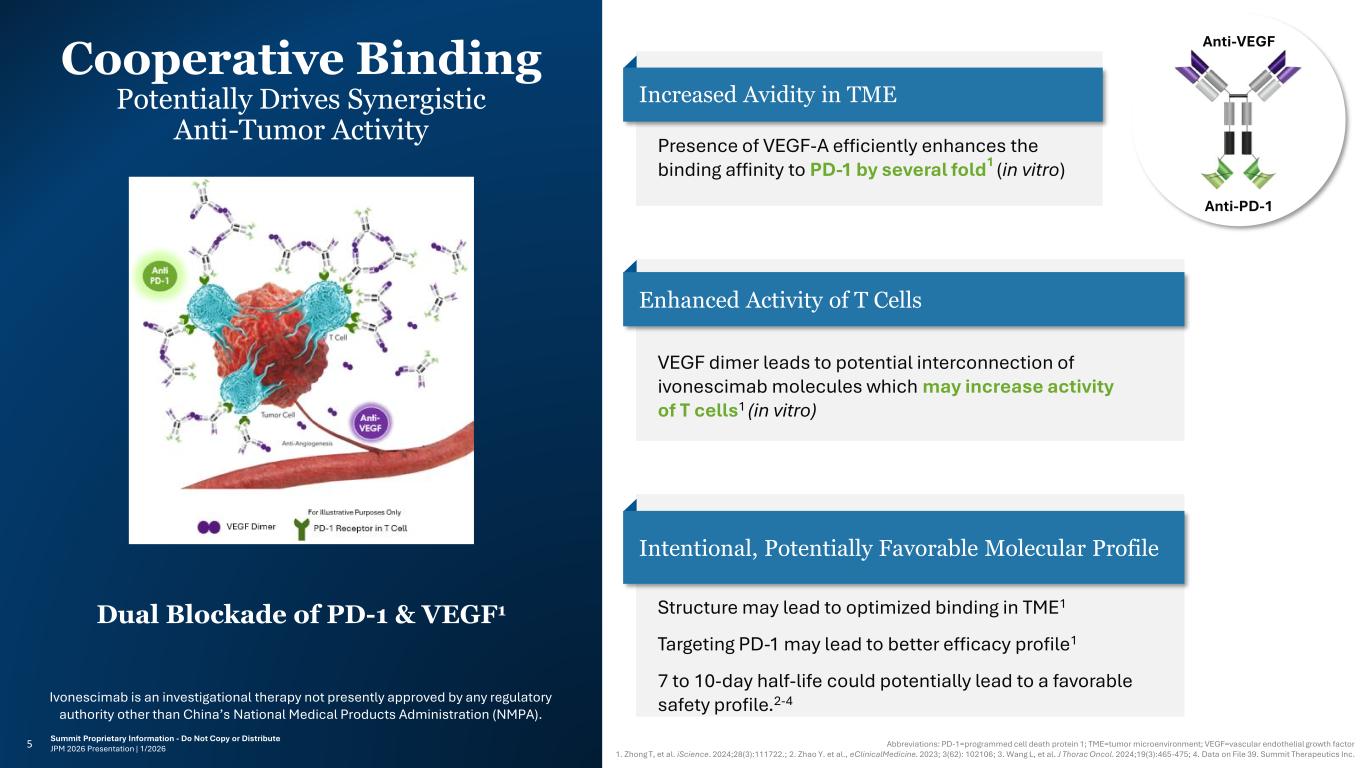 Ivonescimab is an investigational therapy not presently approved by any regulatory authority other than China’s National Medical Products Administration (NMPA). Summit Proprietary Information - Do Not Copy or Distribute JPM 2026 Presentation | 1/20264 Ivonescimab Anti-VEGF Anti-PD-1 Includes both Summit and Akeso trials Total Ivonescimab Trials Sponsored by Summit or Akeso2 Patients Dosed in All Clinical Trials2 Patients Dosed Commercially in China Phase III Trials in Multiple Tumor Types1 Positive Phase III Readouts to Date The only in-class Phase III Readouts Leadership in global oncology with a proven track record with high-speed and quality execution. Proven Track Record 4 Global Phase III Trials Mission: Patients First To improve quality of life, increase potential duration of life, by resolving serious unmet medical needs Indications Approved in China by the NMPA 4 Phase III Trials with Positive Results PD-1 x VEGF Class Frontrunner with Multi-Year Lead 14 Phase III Trials1 >4K Trial Patients 2 Chinese Approvals >60K Commercial Patients in China 42 Sponsored Trials Abbreviations: PD-1=programmed cell death protein 1; VEGF=vascular endothelial growth factor; NMPA = National Medical Products Administration (China) References: 1. Total sponsored (by Summit or Akeso) clinical trials as of January 6, 2026, via clinicaltrials.gov or public announcement; 2. Data on File 56, 57. Summit Therapeutics Inc. Total Trials Involving Ivonescimab on clinicaltrials.gov2 116 Total Trials