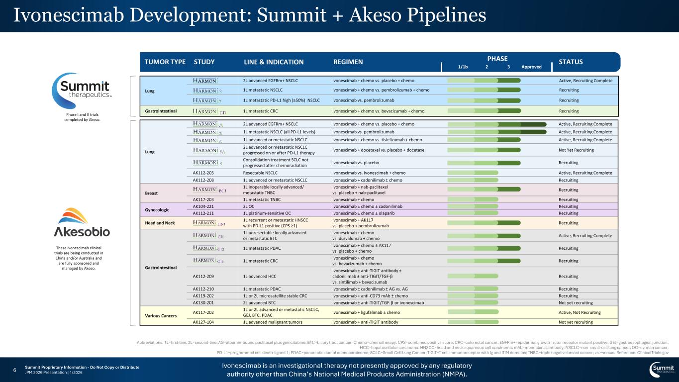 Ivonescimab is an investigational therapy not presently approved by any regulatory authority other than China’s National Medical Products Administration (NMPA). Summit Proprietary Information - Do Not Copy or Distribute JPM 2026 Presentation | MAT-SMTxxx-xxxx | 1/20265 Cooperative Binding Potentially Drives Synergistic Anti-Tumor Activity Ivonescimab is an investigational therapy not presently approved by any regulatory authority other than China’s National Medical Products Administration (NMPA). Anti-VEGF Anti-PD-1 Intentional, Potentially Favorable Molecular Profile Structure may lead to optimized binding in TME1 Targeting PD-1 may lead to better efficacy profile1 7 to 10-day half-life could potentially lead to a favorable safety profile.2-4 Dual Blockade of PD-1 & VEGF1 Increased Avidity in TME Presence of VEGF-A efficiently enhances the binding affinity to PD-1 by several fold1 (in vitro) Enhanced Activity of T Cells VEGF dimer leads to potential interconnection of ivonescimab molecules which may increase activity of T cells1 (in vitro) Abbreviations: PD-1=programmed cell death protein 1; TME=tumor microenvironment; VEGF=vascular endothelial growth factor 1. Zhong T, et al. iScience. 2024;28(3):111722.; 2. Zhao Y. et al., eClinicalMedicine. 2023; 3(62): 102106; 3. Wang L, et al. J Thorac Oncol. 2024;19(3):465-475; 4. Data on File 39. Summit Therapeutics Inc. 1/2026