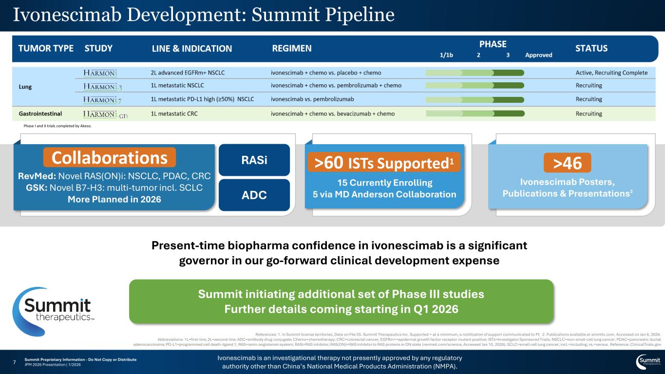 Ivonescimab is an investigational therapy not presently approved by any regulatory authority other than China’s National Medical Products Administration (NMPA). Summit Proprietary Information - Do Not Copy or Distribute JPM 2026 Presentation | 1/20266 Abbreviations: 1L=first-line; 2L=second-line; AG=albumin-bound paclitaxel plus gemcitabine; BTC=biliary tract cancer; Chemo=chemotherapy; CPS=combined positive score; CRC=colorectal cancer; EGFRm+=epidermal growth factor receptor mutant positive; GEJ=gastroesophageal junction; HCC=hepatocellular carcinoma; HNSCC=head and neck squamous cell carcinoma; mAb=monoclonal antibody; NSCLC=non-small-cell lung cancer; OC=ovarian cancer; PD-L1=programmed cell death-ligand 1; PDAC=pancreatic ductal adenocarcinoma; SCLC=Small Cell Lung Cancer; TIGIT=T cell immunoreceptor with Ig and ITIM domains; TNBC=triple negative breast cancer; vs.=versus. Reference: ClinicalTrials.gov These ivonescimab clinical trials are being conducted in China and/or Australia and are fully sponsored and managed by Akeso. TUMOR TYPE STUDY LINE & INDICATION REGIMEN STATUS Approved PHASE 1/1b 2 3 Lung 2L advanced EGFRm+ NSCLC ivonescimab + chemo vs. placebo + chemo Active, Recruiting Complete 1L metastatic NSCLC (all PD-L1 levels) ivonescimab vs. pembrolizumab Active, Recruiting Complete 1L advanced or metastatic NSCLC ivonescimab + chemo vs. tislelizumab + chemo Active, Recruiting Complete 2L advanced or metastatic NSCLC progressed on or after PD-L1 therapy ivonescimab + docetaxel vs. placebo + docetaxel Not Yet Recruiting Consolidation treatment SCLC not progressed after chemoradiation ivonescimab vs. placebo Recruiting AK112-205 Resectable NSCLC ivonescimab vs. ivonescimab + chemo Active, Recruiting Complete AK112-208 1L advanced or metastatic NSCLC ivonescimab + cadonilimab ± chemo Recruiting Breast 1L inoperable locally advanced/ metastatic TNBC ivonescimab + nab-paclitaxel vs. placebo + nab-paclitaxel Recruiting AK117-203 1L metastatic TNBC ivonescimab + chemo Recruiting Gynecologic AK104-221 2L OC ivonescimab ± chemo ± cadonilimab Recruiting AK112-211 1L platinum-sensitive OC ivonescimab ± chemo ± olaparib Recruiting Head and Neck 1L recurrent or metastatic HNSCC with PD-L1 positive (CPS ≥1) ivonescimab + AK117 vs. placebo + pembrolizumab Recruiting Gastrointestinal 1L unresectable locally advanced or metastatic BTC ivonescimab + chemo vs. durvalumab + chemo Active, Recruiting Complete 1L metastatic PDAC ivonescimab + chemo ± AK117 vs. placebo + chemo Recruiting 1L metastatic CRC ivonescimab + chemo vs. bevacizumab + chemo Recruiting AK112-209 1L advanced HCC ivonescimab ± anti-TIGIT antibody ± cadonilimab ± anti-TIGIT/TGF-β vs. sintilimab + bevacizumab Recruiting AK112-210 1L metastatic PDAC ivonescimab ± cadonilimab ± AG vs. AG Recruiting AK119-202 1L or 2L microsatellite stable CRC ivonescimab + anti-CD73 mAb ± chemo Recruiting AK130-201 2L advanced BTC ivonescimab ± anti-TIGIT/TGF-β or ivonescimab Not yet recruiting Various Cancers AK117-202 1L or 2L advanced or metastatic NSCLC, GEJ, BTC, PDAC ivonescimab + ligufalimab ± chemo Active, Not Recruiting AK127-104 1L advanced malignant tumors ivonescimab + anti-TIGIT antibody Not yet recruiting Lung 2L advanced EGFRm+ NSCLC ivonescimab + chemo vs. placebo + chemo Active, Recruiting Complete 1L metastatic NSCLC ivonescimab + chemo vs. pembrolizumab + chemo Recruiting 1L metastatic PD-L1 high (≥50%) NSCLC ivonescimab vs. pembrolizumab Recruiting Gastrointestinal 1L metastatic CRC ivonescimab + chemo vs. bevacizumab + chemo Recruiting Ivonescimab Development: Summit + Akeso Pipelines Phase I and II trials completed by Akeso.
