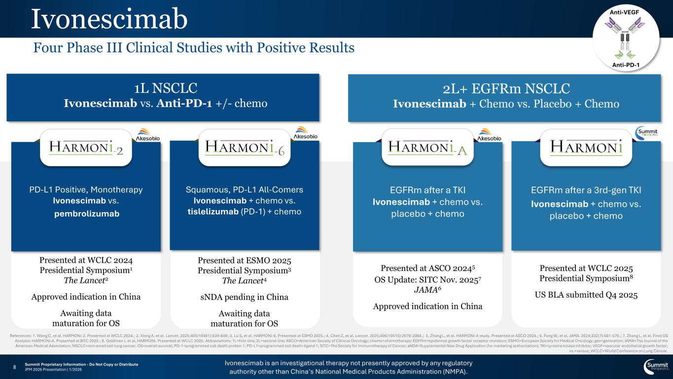 Ivonescimab is an investigational therapy not presently approved by any regulatory authority other than China’s National Medical Products Administration (NMPA). Summit Proprietary Information - Do Not Copy or Distribute JPM 2026 Presentation | 1/20267 Ivonescimab Development Plan Ivo esci ab evelop e t: Summit Pipeline Summit initiating additional set of Phase III studies Further details coming starting in Q1 2026 References: 1. In Summit license territories, Data on File 55. Summit Therapeutics Inc. Supported = at a minimum, a notification of support communicated to PI; 2. Publications available at smmttx.com, Accessed on Jan 6, 2026. Abbreviations: 1L=first-line; 2L=second-line; ADC=antibody drug conjugate; Chemo=chemotherapy; CRC=colorectal cancer; EGFRm+=epidermal growth factor receptor mutant positive; ISTs=Investigator Sponsored Trials; NSCLC=non-small-cell lung cancer; PDAC=pancreatic ductal adenocarcinoma; PD-L1=programmed cell death-ligand 1; RAS=renin-angiotensin system; RASi=RAS inhibitor; RAS(ON)i=RAS inhibitor to RAS proteins in ON state (revmed.com/science, Accessed Jan 10, 2026); SCLC=small cell lung cancer; incl.=including; vs.=versus. Reference: ClinicalTrials.gov Present-time biopharma confidence in ivonescimab is a significant governor in our go-forward clinical development expense Collaborations RevMed: Novel RAS(ON)i: NSCLC, PDAC, CRC GSK: Novel B7-H3: multi-tumor incl. SCLC More Planned in 2026 >60 ISTs1 15 Currently Enrolling 5 via MD Anderson Collaboration 46 Ivonescimab Posters, Publications & Presentations2 RASi ADC llaborations >60 ISTs Supported1 >46 Phase I and II trials completed by Akeso.