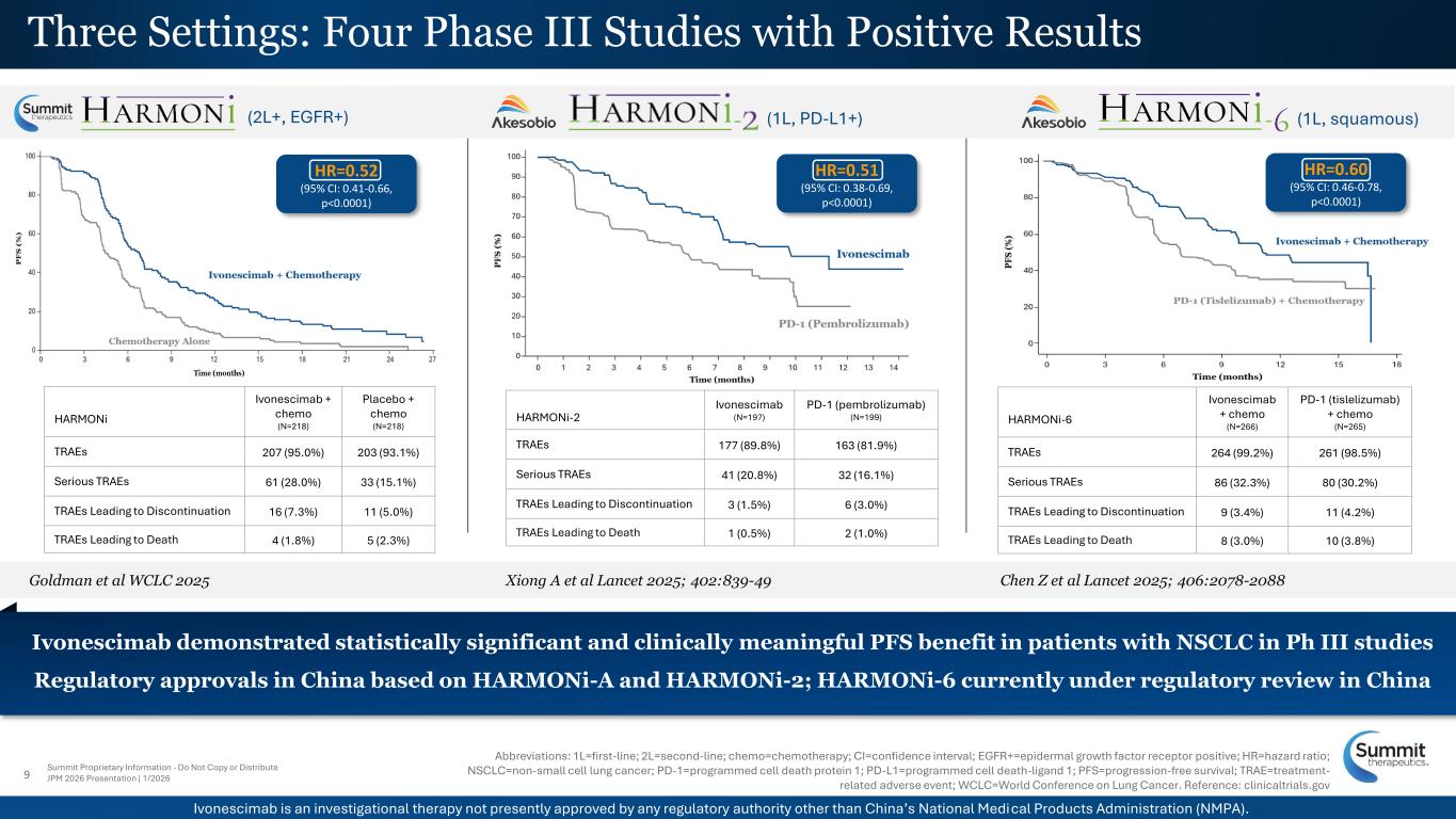 Anti-VEGF Anti-PD-1 Ivonescimab 1L NSCLC Ivonescimab vs. Anti-PD-1 +/- chemo Presented at WCLC 2024 Presidential Symposium1 The Lancet2 Approved indication in China Awaiting data maturation for OS Squamous, PD-L1 All-Comers Ivonescimab + chemo vs. tislelizumab (PD-1) + chemo Presented at ESMO 2025 Presidential Symposium3 The Lancet4 sNDA pending in China Awaiting data maturation for OS 2L+ EGFRm NSCLC Ivonescimab + Chemo vs. Placebo + Chemo EGFRm after a TKI Ivonescimab + chemo vs. placebo + chemo Presented at ASCO 20245 OS Update: SITC Nov. 20257 JAMA6 Approved indication in China EGFRm after a 3rd-gen TKI Ivonescimab + chemo vs. placebo + chemo Presented at WCLC 2025 Presidential Symposium8 US BLA submitted Q4 2025 Ivonescimab is an investigational therapy not presently approved by any regulatory authority other than China’s National Medical Products Administration (NMPA). 8 PD-L1 Positive, Monotherapy Ivonescimab vs. pembrolizumab References: 1. Wang C, et al. HARMONi-2. Presented at WCLC 2024.; 2. Xiong A, et al. Lancet. 2025;405(10481):839-849; 3. Lu S, et al. HARMONi-6. Presented at ESMO 2025.; 4. Chen Z, et al. Lancet. 2025;406(10515):2078-2088.; 5. Zhang L, et al. HARMONi-A study. Presented at ASCO 2024.; 6. Fang W, et al. JAMA. 2024;332(7):561-570.; 7. Zhang L, et al. Final OS Analysis: HARMONi-A. Presented at SITC 2025.; 8. Goldman J, et al. HARMONi. Presented at WCLC 2025. Abbreviations: 1L=first-line; 2L=second-line; ASCO=American Society of Clinical Oncology; chemo=chemotherapy; EGFRm=epidermal growth factor receptor mutation; ESMO=European Society for Medical Oncology; gen=generation; JAMA=The Journal of the American Medical Association; NSCLC=non-small cell lung cancer; OS=overall survival; PD-1=programmed cell death protein 1; PD-L1=programmed cell death-ligand 1; SITC=The Society for Immunotherapy of Cancer; sNDA=Supplemental New Drug Application (for marketing authorization); TKI=tyrosine kinase inhibitor; VEGF=vascular endothelial growth factor; vs.=versus; WCLC=World Conference on Lung Cancer. Four Phase III Clinical Studies with Positive Results Summit Proprietary Information - Do Not Copy or Distribute JPM 2026 Presentation | 1/2026