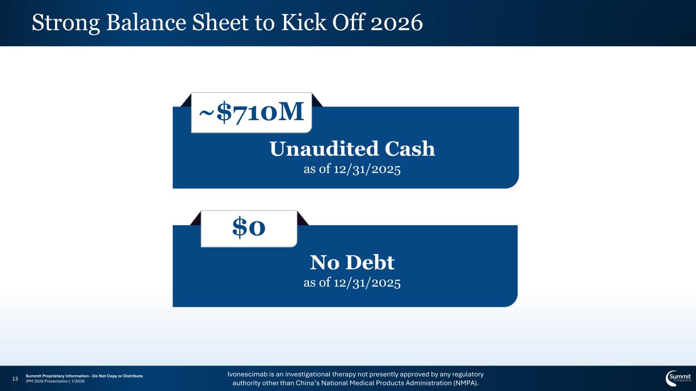 Ivonescimab is an investigational therapy not presently approved by any regulatory authority other than China’s National Medical Products Administration (NMPA). Summit Proprietary Information - Do Not Copy or Distribute JPM 2026 Presentation | 1/202612 Shaping the Path to Become a Commercial Entity 1Q26 Further details beginning this quarter on new global Phase IIIs 1H26 HARMONi-3 SQ: Completion of enrollment expected 2H26 HARMONi-3 SQ: PFS, interim OS data readout expected HARMONi-3 nSQ: Completion of enrollment expected HARMONi: BLA Decision in 2L+ EGFRm NSCLC expected 1H27 HARMONi-3 nSQ: PFS data readout expected Anti-VEGF Anti-PD-1 Abbreviations: 2L=second-line; BLA=Biologics License Application; EGFRm+=epidermal growth factor receptor mutant positive; NSCLC=non-small-cell lung cancer; nSQ=non-squamous; OS=overall survival; PD-1=programmed cell death protein 1; PD-L1=programmed cell death-ligand 1; PFS=progression-free survival; SQ=squamous; VEGF=vascular endothelial growth factor.