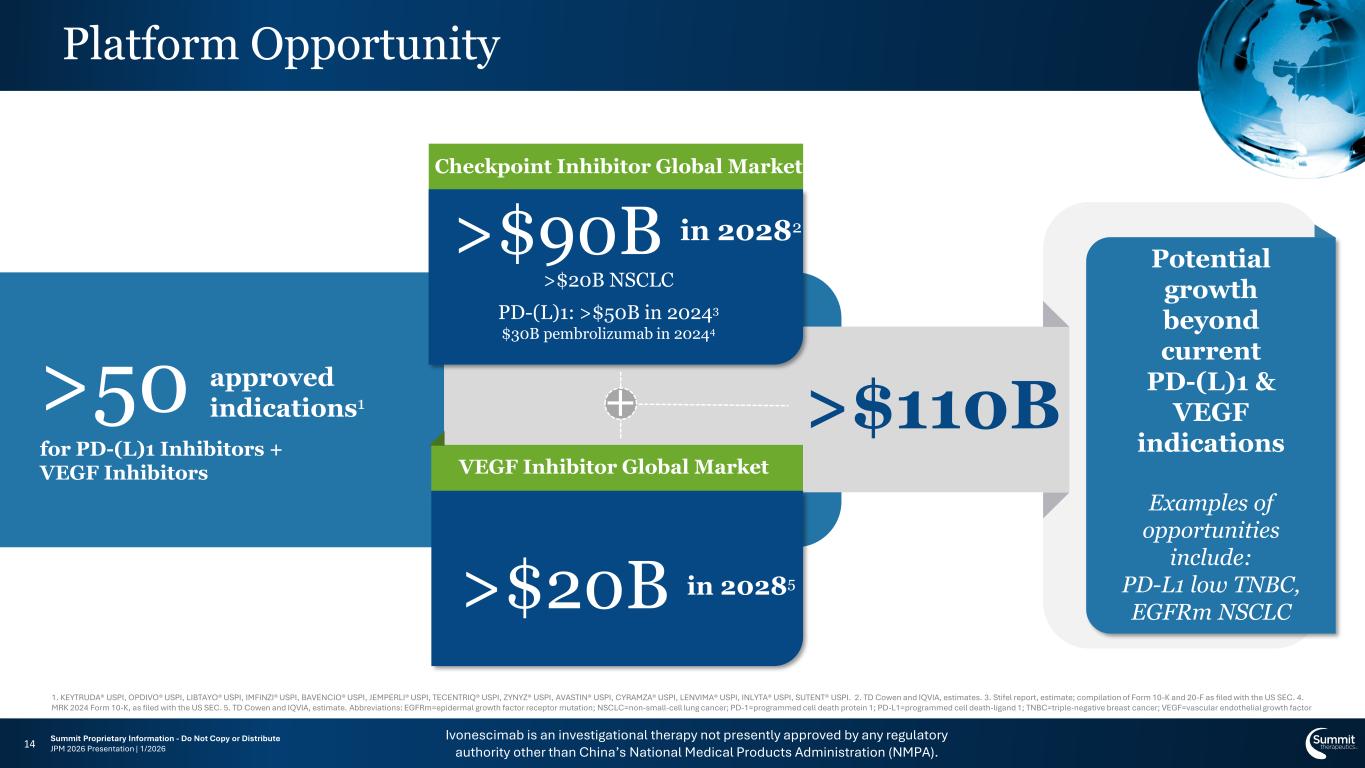 Ivonescimab is an investigational therapy not presently approved by any regulatory authority other than China’s National Medical Products Administration (NMPA). Summit Proprietary Information - Do Not Copy or Distribute JPM 2026 Presentation | 1/2026 Strong Balance Sheet to Kick Off 2026 13 ~$710M Unaudited Cash as of 12/31/2025 $0 No Debt as of 12/31/2025