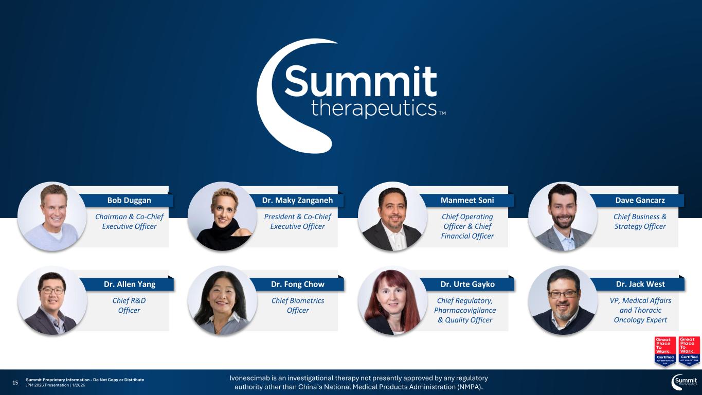 Ivonescimab is an investigational therapy not presently approved by any regulatory authority other than China’s National Medical Products Administration (NMPA). Summit Proprietary Information - Do Not Copy or Distribute JPM 2026 Presentation | 1/2026 Potential growth beyond current PD-(L)1 & VEGF indications Examples of opportunities include: PD-L1 low TNBC, EGFRm NSCLC Platform Opportunity 14 for PD-(L)1 Inhibitors + VEGF Inhibitors >50 approved indications1 + Checkpoint Inhibitor Global Market >$90B in 20282 >$20B NSCLC PD-(L)1: >$50B in 20243 $30B pembrolizumab in 20244 >$20B in 20285 >$110B VEGF Inhibitor Global Market 1. KEYTRUDA® USPI, OPDIVO® USPI, LIBTAYO® USPI, IMFINZI® USPI, BAVENCIO® USPI, JEMPERLI® USPI, TECENTRIQ® USPI, ZYNYZ® USPI, AVASTIN® USPI, CYRAMZA® USPI, LENVIMA® USPI, INLYTA® USPI, SUTENT® USPI. 2. TD Cowen and IQVIA, estimates. 3. Stifel report, estimate; compilation of Form 10-K and 20-F as filed with the US SEC. 4. MRK 2024 Form 10-K, as filed with the US SEC. 5. TD Cowen and IQVIA, estimate. Abbreviations: EGFRm=epidermal growth factor receptor mutation; NSCLC=non-small-cell lung cancer; PD-1=programmed cell death protein 1; PD-L1=programmed cell death-ligand 1; TNBC=triple-negative breast cancer; VEGF=vascular endothelial growth factor