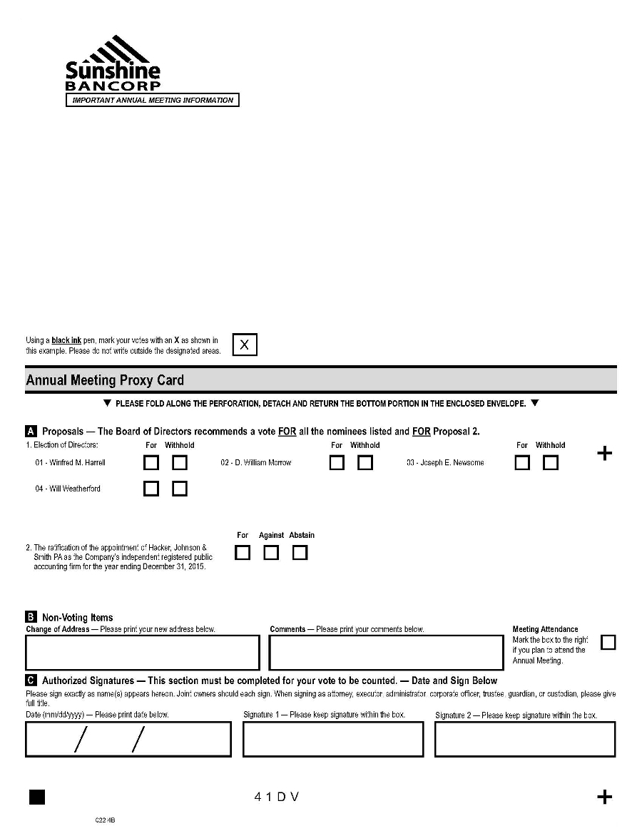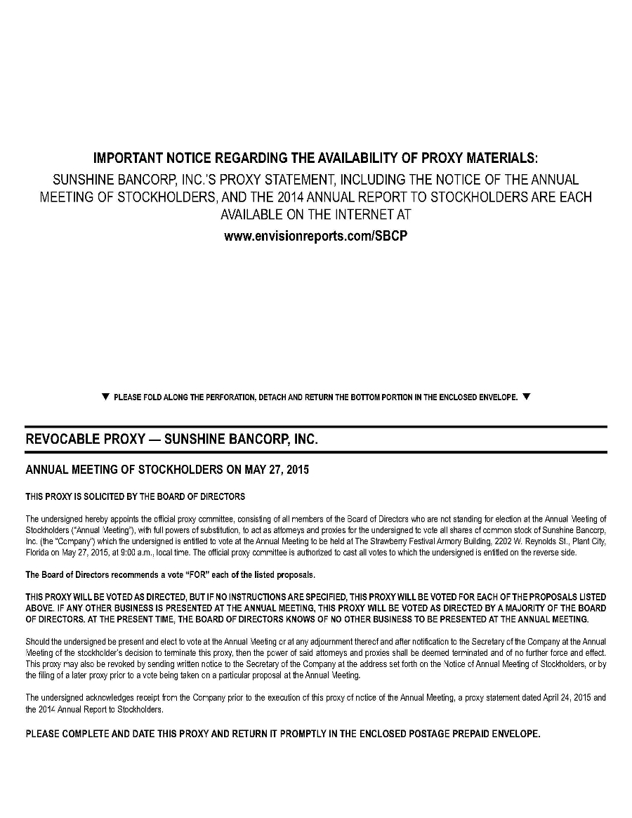 The undersigned hereby appoints the official proxy committee, consisting of all members of the Board of Directors who are not standing for election at the Annual Meeting of Stockholders (“Annual Meeting”), with full powers of substitution, to act as attorneys and proxies for the undersigned to vote all shares of common stock of Sunshine Bancorp, Inc. (the “Company”) which the undersigned is entitled to vote at the Annual Meeting to be held at The Strawberry Festival Armory Building, 2202 W. Reynolds St., Plant City, Florida on May 27, 2015, at 9:00 a.m., local time. The official proxy committee is authorized to cast all votes to which the undersigned is entitled on the reverse side.