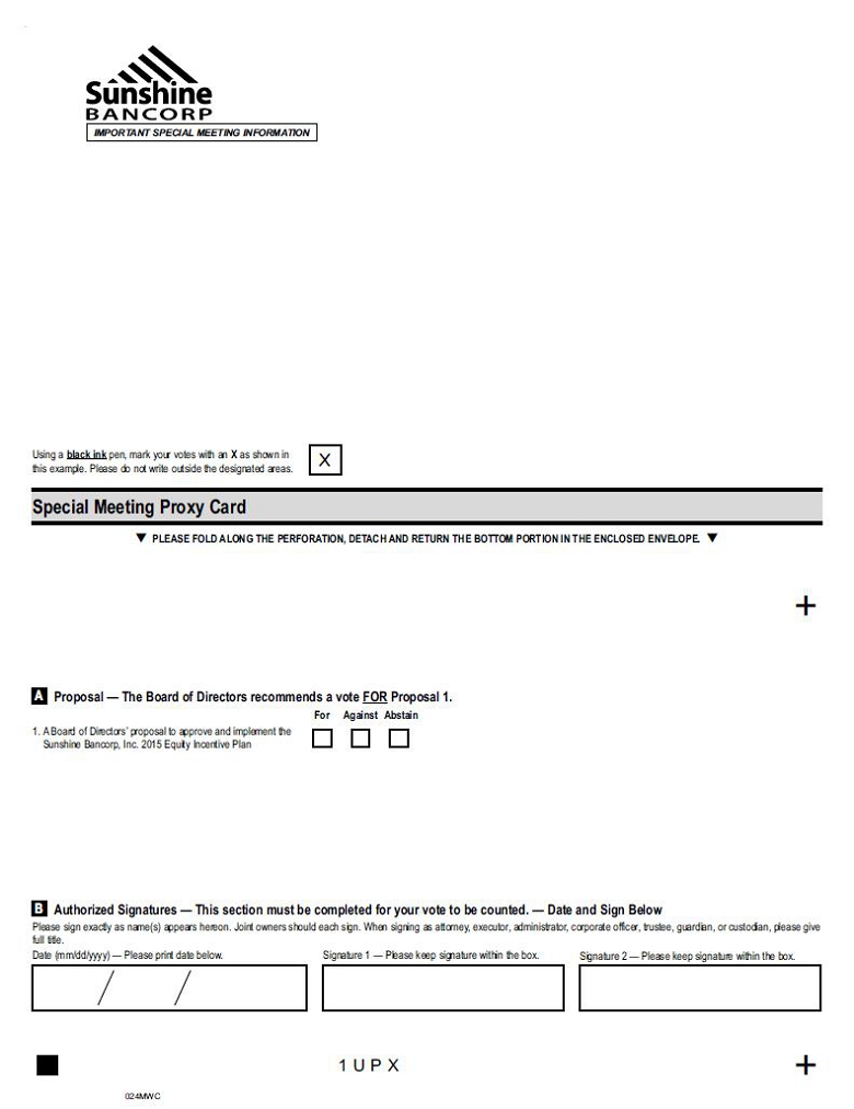 | · | A Board of Directors’ proposal to approve and implement the Sunshine Bancorp, Inc. 2015 Equity Incentive Plan; and |