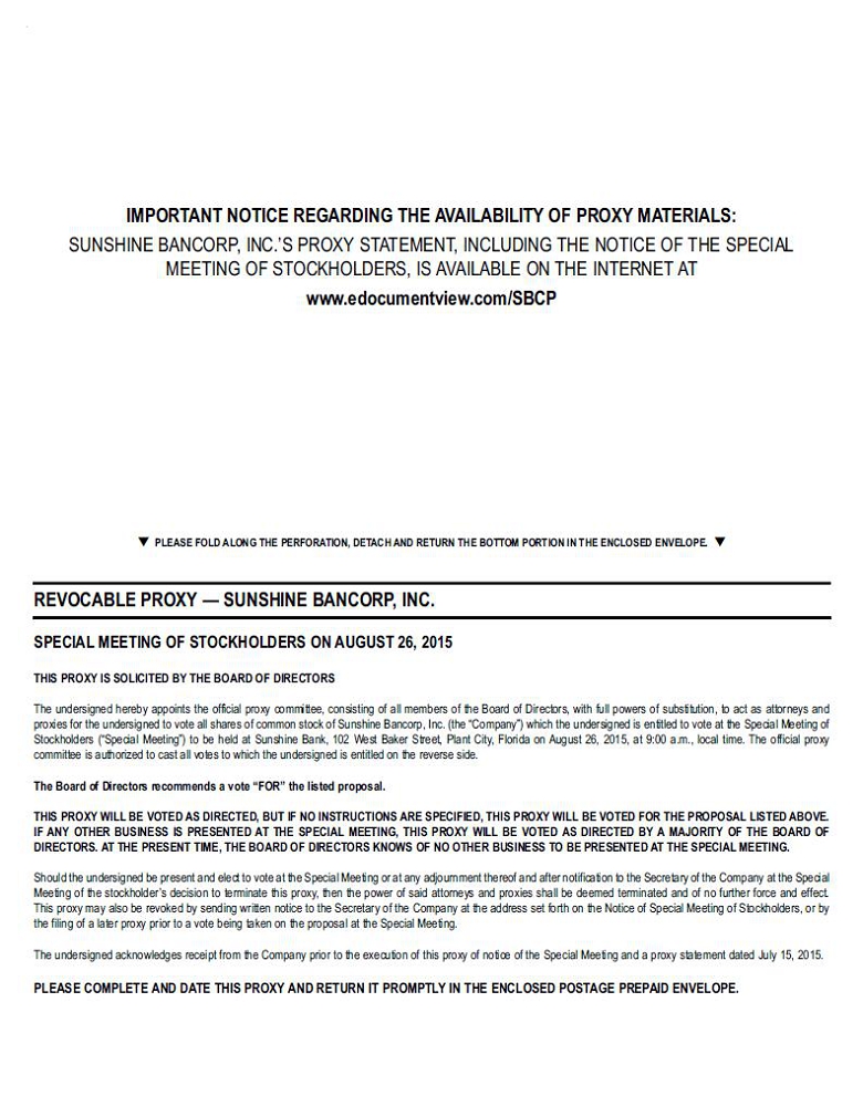 We cordially invite you to attend a Special Meeting of Stockholders of Sunshine Bancorp, Inc., the parent company of Sunshine Bank. The Special Meeting will be held at Sunshine Bank, 102 West Baker Street, Plant City, Florida, at 9:00 a.m. (Eastern time) on August 26, 2015.