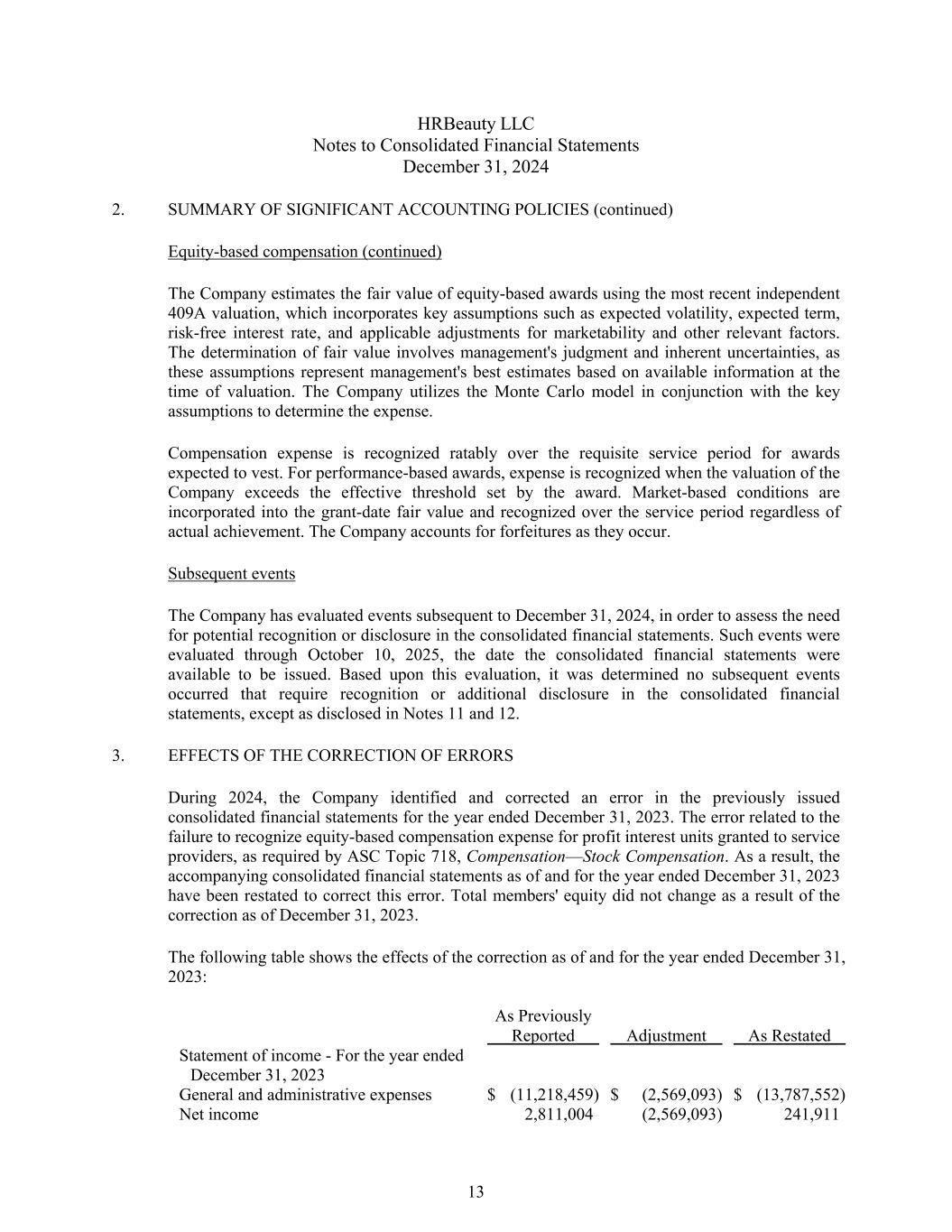 HRBeauty LLC Notes to Consolidated Financial Statements December 31, 2024 2. SUMMARY OF SIGNIFICANT ACCOUNTING POLICIES (continued) Equity-based compensation (continued) The Company estimates the fair value of equity-based awards using the most recent independent 409A valuation, which incorporates key assumptions such as expected volatility, expected term, risk-free interest rate, and applicable adjustments for marketability and other relevant factors. The determination of fair value involves management's judgment and inherent uncertainties, as these assumptions represent management's best estimates based on available information at the time of valuation. The Company utilizes the Monte Carlo model in conjunction with the key assumptions to determine the expense. Compensation expense is recognized ratably over the requisite service period for awards expected to vest. For performance-based awards, expense is recognized when the valuation of the Company exceeds the effective threshold set by the award. Market-based conditions are incorporated into the grant-date fair value and recognized over the service period regardless of actual achievement. The Company accounts for forfeitures as they occur. Subsequent events The Company has evaluated events subsequent to December 31, 2024, in order to assess the need for potential recognition or disclosure in the consolidated financial statements. Such events were evaluated through October 10, 2025, the date the consolidated financial statements were available to be issued. Based upon this evaluation, it was determined no subsequent events occurred that require recognition or additional disclosure in the consolidated financial statements, except as disclosed in Notes 11 and 12. 3. EFFECTS OF THE CORRECTION OF ERRORS During 2024, the Company identified and corrected an error in the previously issued consolidated financial statements for the year ended December 31, 2023. The error related to the failure to recognize equity-based compensation expense for profit interest units granted to service providers, as required by ASC Topic 718, Compensation—Stock Compensation. As a result, the accompanying consolidated financial statements as of and for the year ended December 31, 2023 have been restated to correct this error. Total members' equity did not change as a result of the correction as of December 31, 2023. The following table shows the effects of the correction as of and for the year ended December 31, 2023: As Previously Reported Adjustment As Restated Statement of income - For the year ended December 31, 2023 General and administrative expenses $ (11,218,459) $ (2,569,093) $ (13,787,552) Net income 2,811,004 (2,569,093) 241,911 13