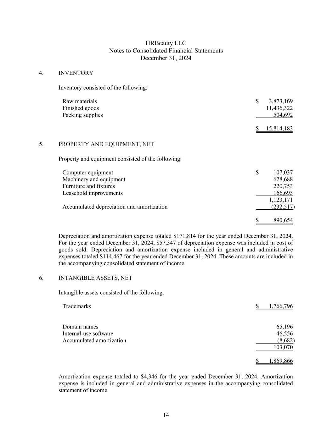 HRBeauty LLC Notes to Consolidated Financial Statements December 31, 2024 4. INVENTORY Inventory consisted of the following: Raw materials $ 3,873,169 Finished goods 11,436,322 Packing supplies 504,692 $ 15,814,183 5. PROPERTY AND EQUIPMENT, NET Property and equipment consisted of the following: Computer equipment $ 107,037 Machinery and equipment 628,688 Furniture and fixtures 220,753 Leasehold improvements 166,693 1,123,171 Accumulated depreciation and amortization (232,517) $ 890,654 Depreciation and amortization expense totaled $171,814 for the year ended December 31, 2024. For the year ended December 31, 2024, $57,347 of depreciation expense was included in cost of goods sold. Depreciation and amortization expense included in general and administrative expenses totaled $114,467 for the year ended December 31, 2024. These amounts are included in the accompanying consolidated statement of income. 6. INTANGIBLE ASSETS, NET Intangible assets consisted of the following: Trademarks $ 1,766,796 Domain names 65,196 Internal-use software 46,556 Accumulated amortization (8,682) 103,070 $ 1,869,866 Amortization expense totaled to $4,346 for the year ended December 31, 2024. Amortization expense is included in general and administrative expenses in the accompanying consolidated statement of income. 14