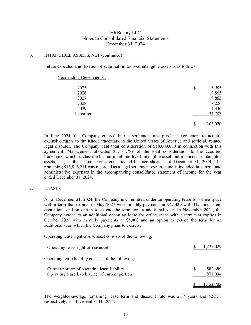 HRBeauty LLC Notes to Consolidated Financial Statements December 31, 2024 6. INTANGIBLE ASSETS, NET (continued) Future expected amortization of acquired finite-lived intangible assets is as follows: Year ending December 31, 2025 $ 15,985 2026 19,865 2027 19,865 2028 8,226 2029 4,346 Thereafter 34,783 $ 103,070 In June 2024, the Company entered into a settlement and purchase agreement to acquire exclusive rights to the Rhode trademark in the United States of America and settle all related legal disputes. The Company paid total consideration of $18,000,000 in connection with this agreement. Management allocated $1,183,789 of the total consideration to the acquired trademark, which is classified as an indefinite-lived intangible asset and included in intangible assets, net, in the accompanying consolidated balance sheet as of December 31, 2024. The remaining $16,816,211 was recorded as a legal settlement expense and is included in general and administrative expenses in the accompanying consolidated statement of income for the year ended December 31, 2024. 7. LEASES As of December 31, 2024, the Company is committed under an operating lease for office space with a term that expires in May 2027 with monthly payments at $47,429 with 3% annual rent escalations and an option to extend the term for an additional year. In November 2024, the Company agreed to an additional operating lease for office space with a term that expires in October 2025 with monthly payments at $5,000 and an option to extend the term for an additional year, which the Company plans to exercise. Operating lease right-of-use asset consists of the following: Operating lease right-of-use asset $ 1,237,029 Operating lease liability consists of the following: Current portion of operating lease liability $ 582,689 Operating lease liability, net of current portion 871,094 $ 1,453,783 The weighted-average remaining lease term and discount rate was 2.37 years and 4.55%, respectively, as of December 31, 2024. 15
