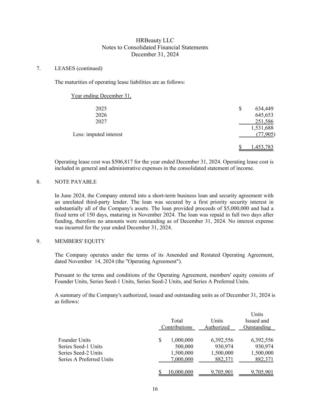 HRBeauty LLC Notes to Consolidated Financial Statements December 31, 2024 7. LEASES (continued) The maturities of operating lease liabilities are as follows: Year ending December 31, 2025 $ 634,449 2026 645,653 2027 251,586 1,531,688 Less: imputed interest (77,905) $ 1,453,783 Operating lease cost was $506,817 for the year ended December 31, 2024. Operating lease cost is included in general and administrative expenses in the consolidated statement of income. 8. NOTE PAYABLE In June 2024, the Company entered into a short-term business loan and security agreement with an unrelated third-party lender. The loan was secured by a first priority security interest in substantially all of the Company's assets. The loan provided proceeds of $5,000,000 and had a fixed term of 150 days, maturing in November 2024. The loan was repaid in full two days after funding, therefore no amounts were outstanding as of December 31, 2024. No interest expense was incurred for the year ended December 31, 2024. 9. MEMBERS' EQUITY The Company operates under the terms of its Amended and Restated Operating Agreement, dated November 14, 2024 (the "Operating Agreement"). Pursuant to the terms and conditions of the Operating Agreement, members' equity consists of Founder Units, Series Seed-1 Units, Series Seed-2 Units, and Series A Preferred Units. A summary of the Company's authorized, issued and outstanding units as of December 31, 2024 is as follows: Total Contributions Units Authorized Units Issued and Outstanding Founder Units $ 1,000,000 6,392,556 6,392,556 Series Seed-1 Units 500,000 930,974 930,974 Series Seed-2 Units 1,500,000 1,500,000 1,500,000 Series A Preferred Units 7,000,000 882,371 882,371 $ 10,000,000 9,705,901 9,705,901 16