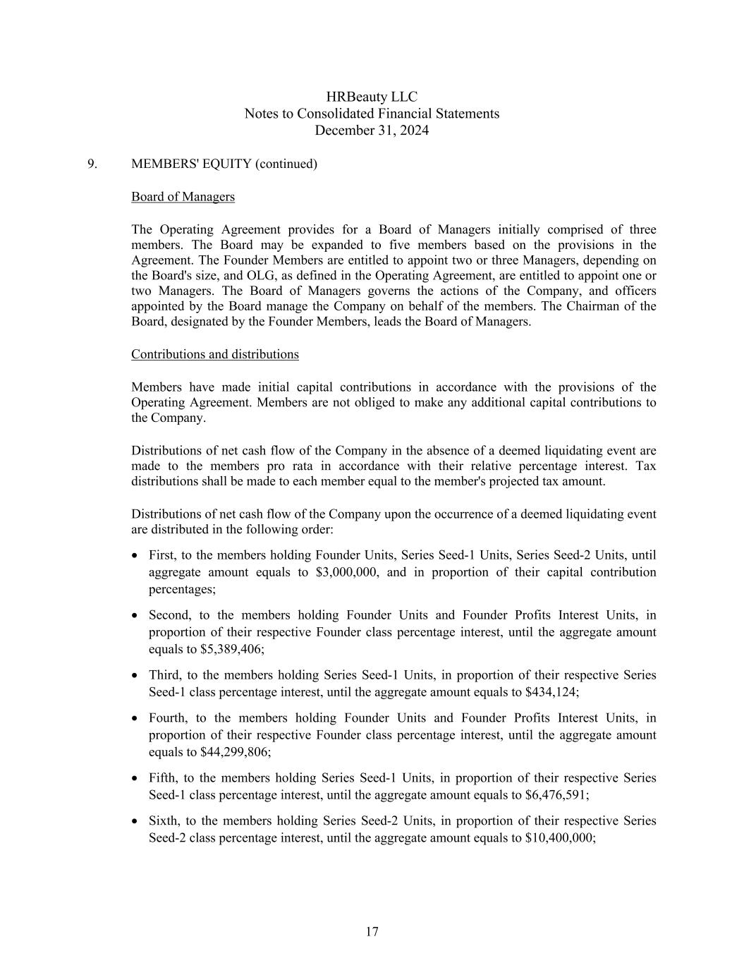 HRBeauty LLC Notes to Consolidated Financial Statements December 31, 2024 9. MEMBERS' EQUITY (continued) Board of Managers The Operating Agreement provides for a Board of Managers initially comprised of three members. The Board may be expanded to five members based on the provisions in the Agreement. The Founder Members are entitled to appoint two or three Managers, depending on the Board's size, and OLG, as defined in the Operating Agreement, are entitled to appoint one or two Managers. The Board of Managers governs the actions of the Company, and officers appointed by the Board manage the Company on behalf of the members. The Chairman of the Board, designated by the Founder Members, leads the Board of Managers. Contributions and distributions Members have made initial capital contributions in accordance with the provisions of the Operating Agreement. Members are not obliged to make any additional capital contributions to the Company. Distributions of net cash flow of the Company in the absence of a deemed liquidating event are made to the members pro rata in accordance with their relative percentage interest. Tax distributions shall be made to each member equal to the member's projected tax amount. Distributions of net cash flow of the Company upon the occurrence of a deemed liquidating event are distributed in the following order: First, to the members holding Founder Units, Series Seed-1 Units, Series Seed-2 Units, until aggregate amount equals to $3,000,000, and in proportion of their capital contribution percentages; Second, to the members holding Founder Units and Founder Profits Interest Units, in proportion of their respective Founder class percentage interest, until the aggregate amount equals to $5,389,406; Third, to the members holding Series Seed-1 Units, in proportion of their respective Series Seed-1 class percentage interest, until the aggregate amount equals to $434,124; Fourth, to the members holding Founder Units and Founder Profits Interest Units, in proportion of their respective Founder class percentage interest, until the aggregate amount equals to $44,299,806; Fifth, to the members holding Series Seed-1 Units, in proportion of their respective Series Seed-1 class percentage interest, until the aggregate amount equals to $6,476,591; Sixth, to the members holding Series Seed-2 Units, in proportion of their respective Series Seed-2 class percentage interest, until the aggregate amount equals to $10,400,000; 17