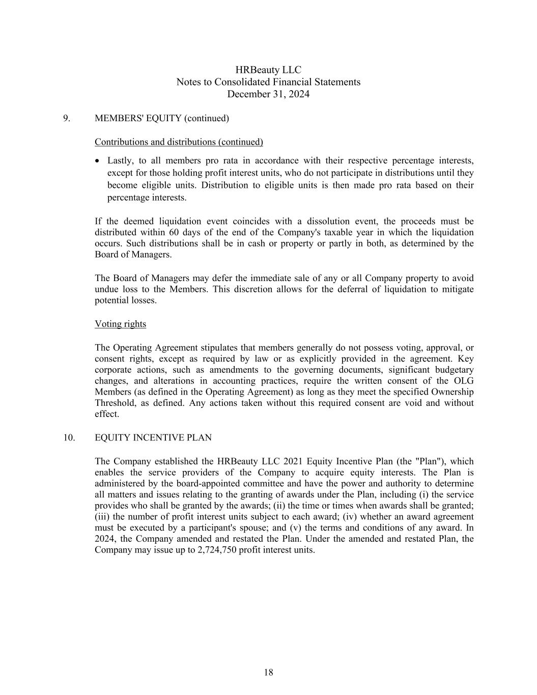 HRBeauty LLC Notes to Consolidated Financial Statements December 31, 2024 9. MEMBERS' EQUITY (continued) Contributions and distributions (continued) Lastly, to all members pro rata in accordance with their respective percentage interests, except for those holding profit interest units, who do not participate in distributions until they become eligible units. Distribution to eligible units is then made pro rata based on their percentage interests. If the deemed liquidation event coincides with a dissolution event, the proceeds must be distributed within 60 days of the end of the Company's taxable year in which the liquidation occurs. Such distributions shall be in cash or property or partly in both, as determined by the Board of Managers. The Board of Managers may defer the immediate sale of any or all Company property to avoid undue loss to the Members. This discretion allows for the deferral of liquidation to mitigate potential losses. Voting rights The Operating Agreement stipulates that members generally do not possess voting, approval, or consent rights, except as required by law or as explicitly provided in the agreement. Key corporate actions, such as amendments to the governing documents, significant budgetary changes, and alterations in accounting practices, require the written consent of the OLG Members (as defined in the Operating Agreement) as long as they meet the specified Ownership Threshold, as defined. Any actions taken without this required consent are void and without effect. 10. EQUITY INCENTIVE PLAN The Company established the HRBeauty LLC 2021 Equity Incentive Plan (the "Plan"), which enables the service providers of the Company to acquire equity interests. The Plan is administered by the board-appointed committee and have the power and authority to determine all matters and issues relating to the granting of awards under the Plan, including (i) the service provides who shall be granted by the awards; (ii) the time or times when awards shall be granted; (iii) the number of profit interest units subject to each award; (iv) whether an award agreement must be executed by a participant's spouse; and (v) the terms and conditions of any award. In 2024, the Company amended and restated the Plan. Under the amended and restated Plan, the Company may issue up to 2,724,750 profit interest units. 18