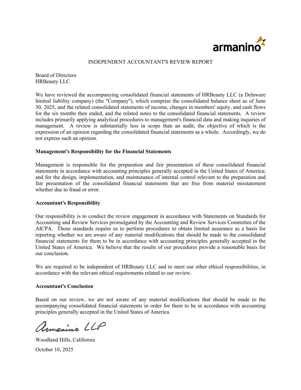 INDEPENDENT ACCOUNTANT'S REVIEW REPORT Board of Directors HRBeauty LLC We have reviewed the accompanying consolidated financial statements of HRBeauty LLC (a Delaware limited liability company) (the ''Company''), which comprise the consolidated balance sheet as of June 30, 2025, and the related consolidated statements of income, changes in members' equity, and cash flows for the six months then ended, and the related notes to the consolidated financial statements. A review includes primarily applying analytical procedures to management's financial data and making inquiries of management. A review is substantially less in scope than an audit, the objective of which is the expression of an opinion regarding the consolidated financial statements as a whole. Accordingly, we do not express such an opinion. Management's Responsibility for the Financial Statements Management is responsible for the preparation and fair presentation of these consolidated financial statements in accordance with accounting principles generally accepted in the United States of America; and for the design, implementation, and maintenance of internal control relevant to the preparation and fair presentation of the consolidated financial statements that are free from material misstatement whether due to fraud or error. Accountant's Responsibility Our responsibility is to conduct the review engagement in accordance with Statements on Standards for Accounting and Review Services promulgated by the Accounting and Review Services Committee of the AICPA. Those standards require us to perform procedures to obtain limited assurance as a basis for reporting whether we are aware of any material modifications that should be made to the consolidated financial statements for them to be in accordance with accounting principles generally accepted in the United States of America. We believe that the results of our procedures provide a reasonable basis for our conclusion. We are required to be independent of HRBeauty LLC and to meet our other ethical responsibilities, in accordance with the relevant ethical requirements related to our review. Accountant's Conclusion Based on our review, we are not aware of any material modifications that should be made to the accompanying consolidated financial statements in order for them to be in accordance with accounting principles generally accepted in the United States of America. Woodland Hills, California October 10, 2025 1