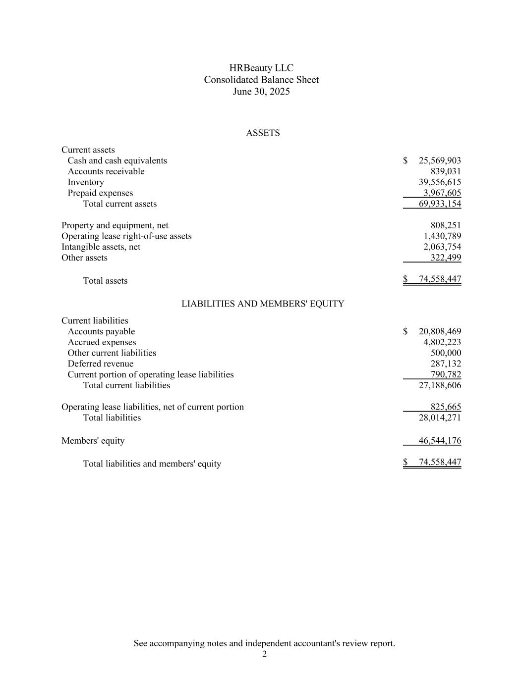 HRBeauty LLC Consolidated Balance Sheet June 30, 2025 ASSETS Current assets Cash and cash equivalents $ 25,569,903 Accounts receivable 839,031 Inventory 39,556,615 Prepaid expenses 3,967,605 Total current assets 69,933,154 Property and equipment, net 808,251 Operating lease right-of-use assets 1,430,789 Intangible assets, net 2,063,754 Other assets 322,499 Total assets $ 74,558,447 LIABILITIES AND MEMBERS' EQUITY Current liabilities Accounts payable $ 20,808,469 Accrued expenses 4,802,223 Other current liabilities 500,000 Deferred revenue 287,132 Current portion of operating lease liabilities 790,782 Total current liabilities 27,188,606 Operating lease liabilities, net of current portion 825,665 Total liabilities 28,014,271 Members' equity 46,544,176 Total liabilities and members' equity $ 74,558,447 See accompanying notes and independent accountant's review report. 2