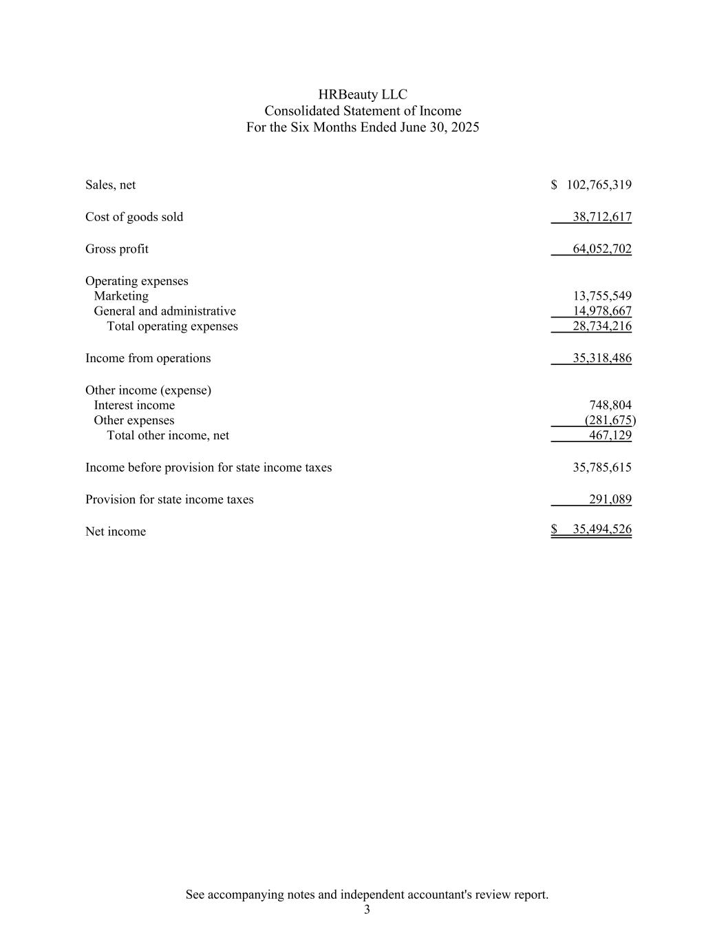 HRBeauty LLC Consolidated Statement of Income For the Six Months Ended June 30, 2025 Sales, net $ 102,765,319 Cost of goods sold 38,712,617 Gross profit 64,052,702 Operating expenses Marketing 13,755,549 General and administrative 14,978,667 Total operating expenses 28,734,216 Income from operations 35,318,486 Other income (expense) Interest income 748,804 Other expenses (281,675) Total other income, net 467,129 Income before provision for state income taxes 35,785,615 Provision for state income taxes 291,089 Net income $ 35,494,526 See accompanying notes and independent accountant's review report. 3
