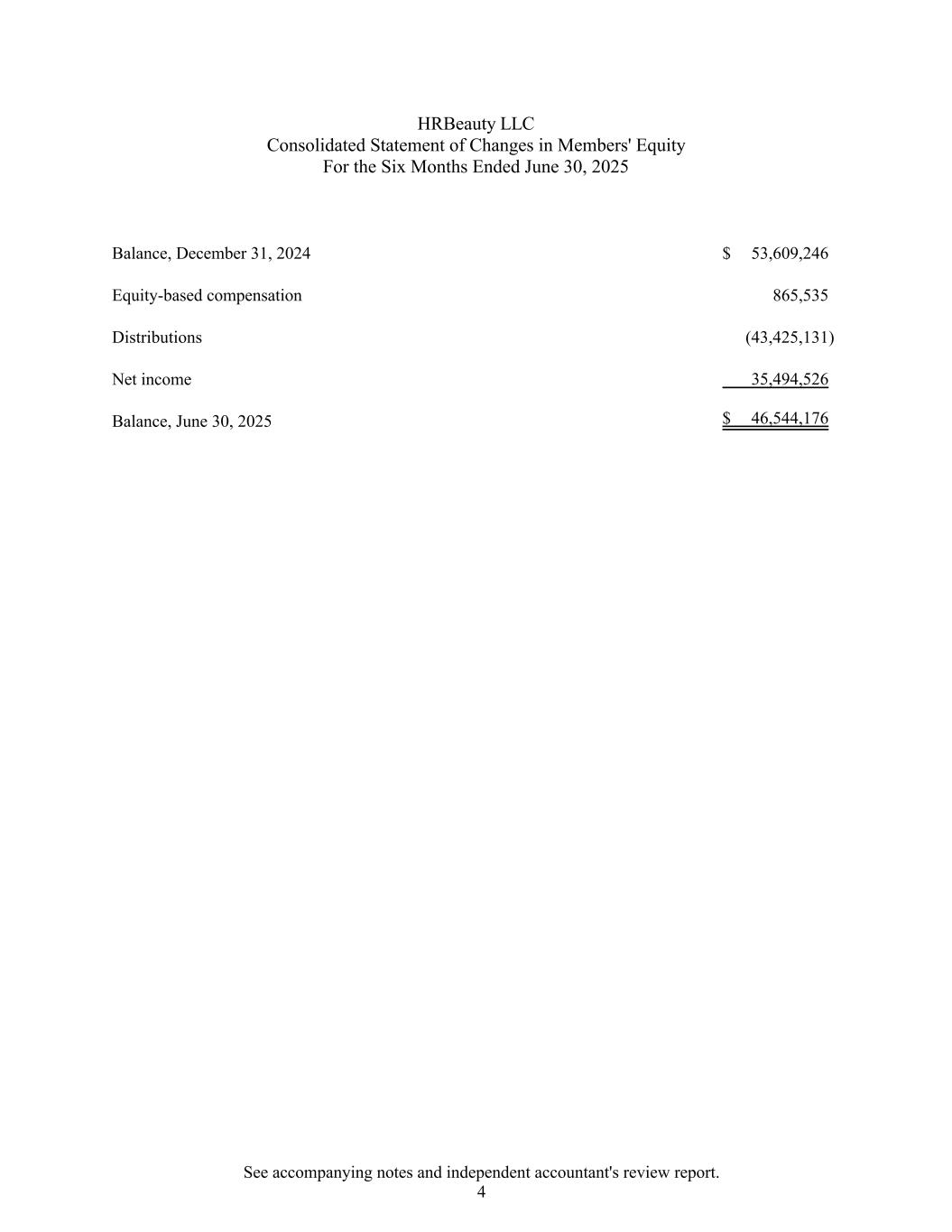 HRBeauty LLC Consolidated Statement of Changes in Members' Equity For the Six Months Ended June 30, 2025 Balance, December 31, 2024 $ 53,609,246 Equity-based compensation 865,535 Distributions (43,425,131) Net income 35,494,526 Balance, June 30, 2025 $ 46,544,176 See accompanying notes and independent accountant's review report. 4