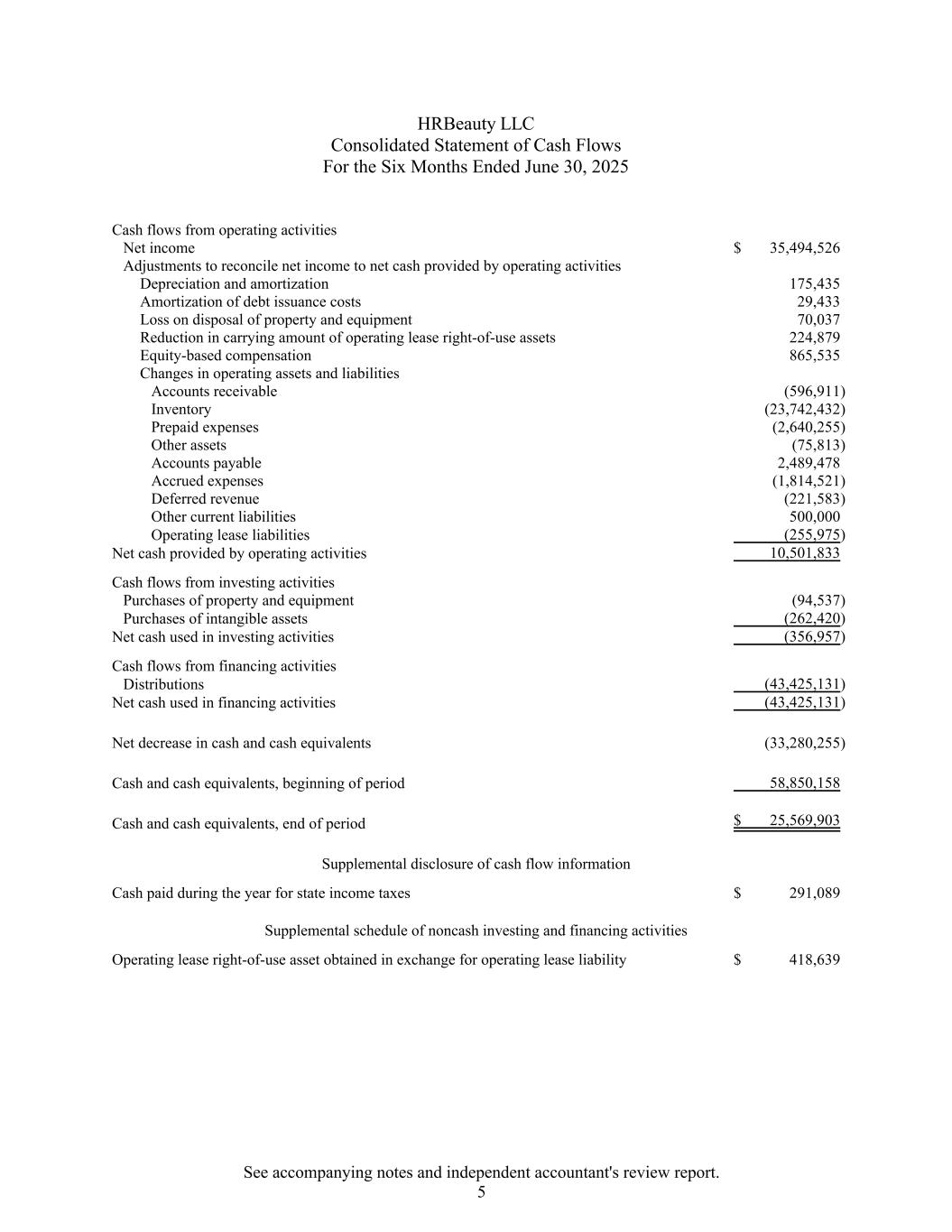 HRBeauty LLC Consolidated Statement of Cash Flows For the Six Months Ended June 30, 2025 Cash flows from operating activities Net income $ 35,494,526 Adjustments to reconcile net income to net cash provided by operating activities Depreciation and amortization 175,435 Amortization of debt issuance costs 29,433 Loss on disposal of property and equipment 70,037 Reduction in carrying amount of operating lease right-of-use assets 224,879 Equity-based compensation 865,535 Changes in operating assets and liabilities Accounts receivable (596,911) Inventory (23,742,432) Prepaid expenses (2,640,255) Other assets (75,813) Accounts payable 2,489,478 Accrued expenses (1,814,521) Deferred revenue (221,583) Other current liabilities 500,000 Operating lease liabilities (255,975) Net cash provided by operating activities 10,501,833 Cash flows from investing activities Purchases of property and equipment (94,537) Purchases of intangible assets (262,420) Net cash used in investing activities (356,957) Cash flows from financing activities Distributions (43,425,131) Net cash used in financing activities (43,425,131) Net decrease in cash and cash equivalents (33,280,255) Cash and cash equivalents, beginning of period 58,850,158 Cash and cash equivalents, end of period $ 25,569,903 Supplemental disclosure of cash flow information Cash paid during the year for state income taxes $ 291,089 Supplemental schedule of noncash investing and financing activities Operating lease right-of-use asset obtained in exchange for operating lease liability $ 418,639 See accompanying notes and independent accountant's review report. 5