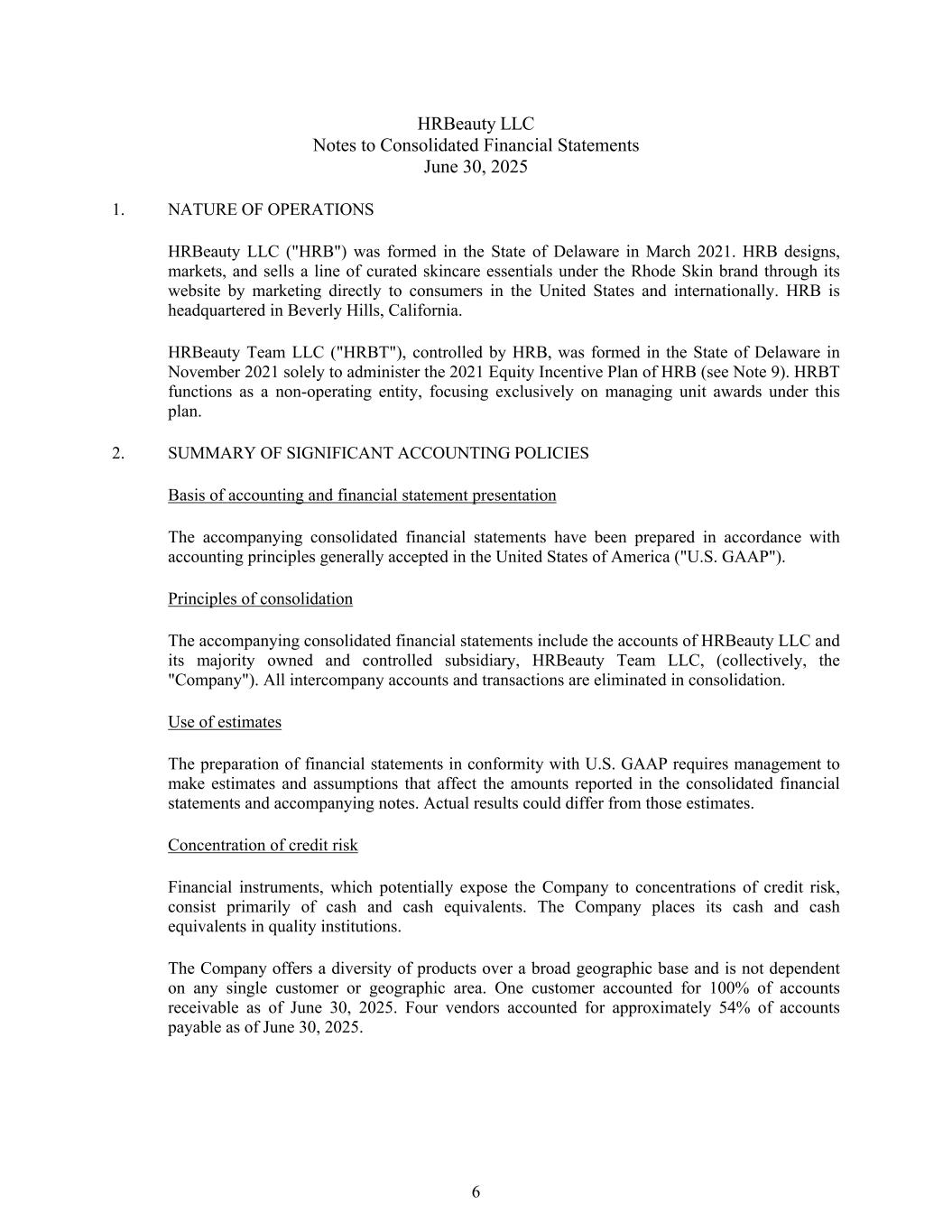HRBeauty LLC Notes to Consolidated Financial Statements June 30, 2025 1. NATURE OF OPERATIONS HRBeauty LLC ("HRB") was formed in the State of Delaware in March 2021. HRB designs, markets, and sells a line of curated skincare essentials under the Rhode Skin brand through its website by marketing directly to consumers in the United States and internationally. HRB is headquartered in Beverly Hills, California. HRBeauty Team LLC ("HRBT"), controlled by HRB, was formed in the State of Delaware in November 2021 solely to administer the 2021 Equity Incentive Plan of HRB (see Note 9). HRBT functions as a non-operating entity, focusing exclusively on managing unit awards under this plan. 2. SUMMARY OF SIGNIFICANT ACCOUNTING POLICIES Basis of accounting and financial statement presentation The accompanying consolidated financial statements have been prepared in accordance with accounting principles generally accepted in the United States of America ("U.S. GAAP"). Principles of consolidation The accompanying consolidated financial statements include the accounts of HRBeauty LLC and its majority owned and controlled subsidiary, HRBeauty Team LLC, (collectively, the "Company"). All intercompany accounts and transactions are eliminated in consolidation. Use of estimates The preparation of financial statements in conformity with U.S. GAAP requires management to make estimates and assumptions that affect the amounts reported in the consolidated financial statements and accompanying notes. Actual results could differ from those estimates. Concentration of credit risk Financial instruments, which potentially expose the Company to concentrations of credit risk, consist primarily of cash and cash equivalents. The Company places its cash and cash equivalents in quality institutions. The Company offers a diversity of products over a broad geographic base and is not dependent on any single customer or geographic area. One customer accounted for 100% of accounts receivable as of June 30, 2025. Four vendors accounted for approximately 54% of accounts payable as of June 30, 2025. 6