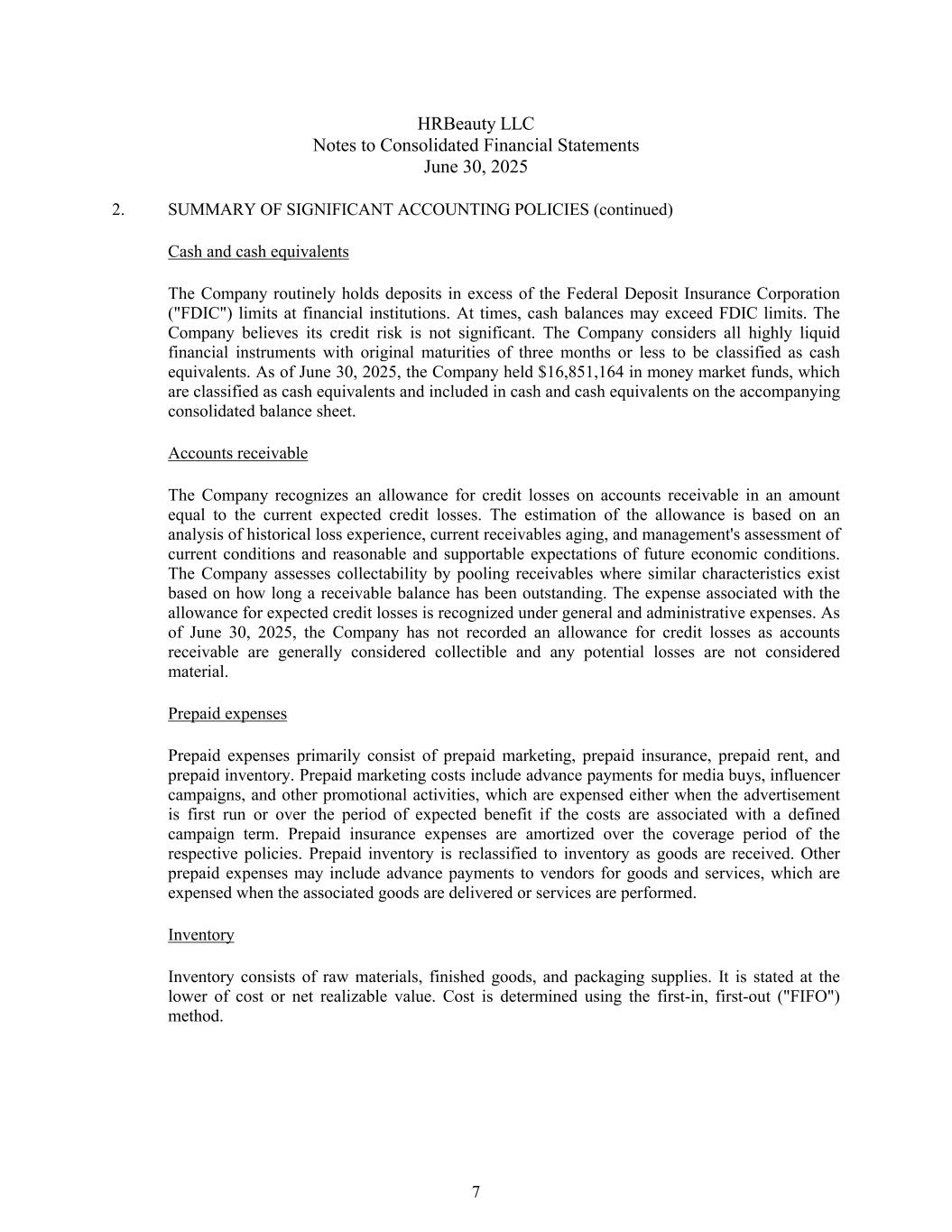 HRBeauty LLC Notes to Consolidated Financial Statements June 30, 2025 2. SUMMARY OF SIGNIFICANT ACCOUNTING POLICIES (continued) Cash and cash equivalents The Company routinely holds deposits in excess of the Federal Deposit Insurance Corporation ("FDIC") limits at financial institutions. At times, cash balances may exceed FDIC limits. The Company believes its credit risk is not significant. The Company considers all highly liquid financial instruments with original maturities of three months or less to be classified as cash equivalents. As of June 30, 2025, the Company held $16,851,164 in money market funds, which are classified as cash equivalents and included in cash and cash equivalents on the accompanying consolidated balance sheet. Accounts receivable The Company recognizes an allowance for credit losses on accounts receivable in an amount equal to the current expected credit losses. The estimation of the allowance is based on an analysis of historical loss experience, current receivables aging, and management's assessment of current conditions and reasonable and supportable expectations of future economic conditions. The Company assesses collectability by pooling receivables where similar characteristics exist based on how long a receivable balance has been outstanding. The expense associated with the allowance for expected credit losses is recognized under general and administrative expenses. As of June 30, 2025, the Company has not recorded an allowance for credit losses as accounts receivable are generally considered collectible and any potential losses are not considered material. Prepaid expenses Prepaid expenses primarily consist of prepaid marketing, prepaid insurance, prepaid rent, and prepaid inventory. Prepaid marketing costs include advance payments for media buys, influencer campaigns, and other promotional activities, which are expensed either when the advertisement is first run or over the period of expected benefit if the costs are associated with a defined campaign term. Prepaid insurance expenses are amortized over the coverage period of the respective policies. Prepaid inventory is reclassified to inventory as goods are received. Other prepaid expenses may include advance payments to vendors for goods and services, which are expensed when the associated goods are delivered or services are performed. Inventory Inventory consists of raw materials, finished goods, and packaging supplies. It is stated at the lower of cost or net realizable value. Cost is determined using the first-in, first-out ("FIFO") method. 7