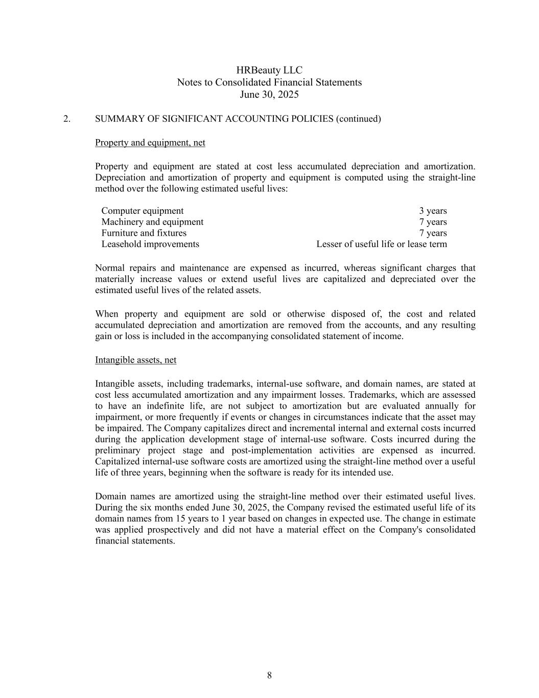 HRBeauty LLC Notes to Consolidated Financial Statements June 30, 2025 2. SUMMARY OF SIGNIFICANT ACCOUNTING POLICIES (continued) Property and equipment, net Property and equipment are stated at cost less accumulated depreciation and amortization. Depreciation and amortization of property and equipment is computed using the straight-line method over the following estimated useful lives: Computer equipment 3 years Machinery and equipment 7 years Furniture and fixtures 7 years Leasehold improvements Lesser of useful life or lease term Normal repairs and maintenance are expensed as incurred, whereas significant charges that materially increase values or extend useful lives are capitalized and depreciated over the estimated useful lives of the related assets. When property and equipment are sold or otherwise disposed of, the cost and related accumulated depreciation and amortization are removed from the accounts, and any resulting gain or loss is included in the accompanying consolidated statement of income. Intangible assets, net Intangible assets, including trademarks, internal-use software, and domain names, are stated at cost less accumulated amortization and any impairment losses. Trademarks, which are assessed to have an indefinite life, are not subject to amortization but are evaluated annually for impairment, or more frequently if events or changes in circumstances indicate that the asset may be impaired. The Company capitalizes direct and incremental internal and external costs incurred during the application development stage of internal-use software. Costs incurred during the preliminary project stage and post-implementation activities are expensed as incurred. Capitalized internal-use software costs are amortized using the straight-line method over a useful life of three years, beginning when the software is ready for its intended use. Domain names are amortized using the straight-line method over their estimated useful lives. During the six months ended June 30, 2025, the Company revised the estimated useful life of its domain names from 15 years to 1 year based on changes in expected use. The change in estimate was applied prospectively and did not have a material effect on the Company's consolidated financial statements. 8