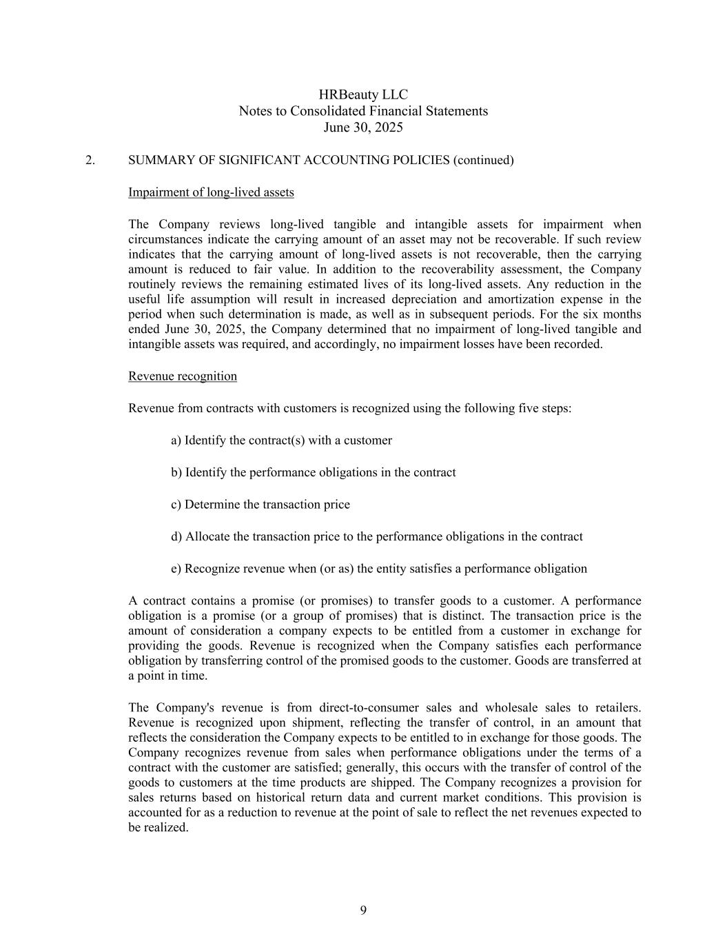 HRBeauty LLC Notes to Consolidated Financial Statements June 30, 2025 2. SUMMARY OF SIGNIFICANT ACCOUNTING POLICIES (continued) Impairment of long-lived assets The Company reviews long-lived tangible and intangible assets for impairment when circumstances indicate the carrying amount of an asset may not be recoverable. If such review indicates that the carrying amount of long-lived assets is not recoverable, then the carrying amount is reduced to fair value. In addition to the recoverability assessment, the Company routinely reviews the remaining estimated lives of its long-lived assets. Any reduction in the useful life assumption will result in increased depreciation and amortization expense in the period when such determination is made, as well as in subsequent periods. For the six months ended June 30, 2025, the Company determined that no impairment of long-lived tangible and intangible assets was required, and accordingly, no impairment losses have been recorded. Revenue recognition Revenue from contracts with customers is recognized using the following five steps: a) Identify the contract(s) with a customer b) Identify the performance obligations in the contract c) Determine the transaction price d) Allocate the transaction price to the performance obligations in the contract e) Recognize revenue when (or as) the entity satisfies a performance obligation A contract contains a promise (or promises) to transfer goods to a customer. A performance obligation is a promise (or a group of promises) that is distinct. The transaction price is the amount of consideration a company expects to be entitled from a customer in exchange for providing the goods. Revenue is recognized when the Company satisfies each performance obligation by transferring control of the promised goods to the customer. Goods are transferred at a point in time. The Company's revenue is from direct-to-consumer sales and wholesale sales to retailers. Revenue is recognized upon shipment, reflecting the transfer of control, in an amount that reflects the consideration the Company expects to be entitled to in exchange for those goods. The Company recognizes revenue from sales when performance obligations under the terms of a contract with the customer are satisfied; generally, this occurs with the transfer of control of the goods to customers at the time products are shipped. The Company recognizes a provision for sales returns based on historical return data and current market conditions. This provision is accounted for as a reduction to revenue at the point of sale to reflect the net revenues expected to be realized. 9