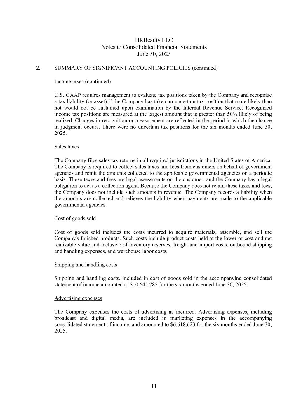 HRBeauty LLC Notes to Consolidated Financial Statements June 30, 2025 2. SUMMARY OF SIGNIFICANT ACCOUNTING POLICIES (continued) Income taxes (continued) U.S. GAAP requires management to evaluate tax positions taken by the Company and recognize a tax liability (or asset) if the Company has taken an uncertain tax position that more likely than not would not be sustained upon examination by the Internal Revenue Service. Recognized income tax positions are measured at the largest amount that is greater than 50% likely of being realized. Changes in recognition or measurement are reflected in the period in which the change in judgment occurs. There were no uncertain tax positions for the six months ended June 30, 2025. Sales taxes The Company files sales tax returns in all required jurisdictions in the United States of America. The Company is required to collect sales taxes and fees from customers on behalf of government agencies and remit the amounts collected to the applicable governmental agencies on a periodic basis. These taxes and fees are legal assessments on the customer, and the Company has a legal obligation to act as a collection agent. Because the Company does not retain these taxes and fees, the Company does not include such amounts in revenue. The Company records a liability when the amounts are collected and relieves the liability when payments are made to the applicable governmental agencies. Cost of goods sold Cost of goods sold includes the costs incurred to acquire materials, assemble, and sell the Company's finished products. Such costs include product costs held at the lower of cost and net realizable value and inclusive of inventory reserves, freight and import costs, outbound shipping and handling expenses, and warehouse labor costs. Shipping and handling costs Shipping and handling costs, included in cost of goods sold in the accompanying consolidated statement of income amounted to $10,645,785 for the six months ended June 30, 2025. Advertising expenses The Company expenses the costs of advertising as incurred. Advertising expenses, including broadcast and digital media, are included in marketing expenses in the accompanying consolidated statement of income, and amounted to $6,618,623 for the six months ended June 30, 2025. 11