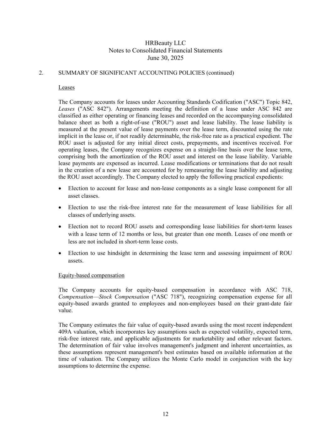 HRBeauty LLC Notes to Consolidated Financial Statements June 30, 2025 2. SUMMARY OF SIGNIFICANT ACCOUNTING POLICIES (continued) Leases The Company accounts for leases under Accounting Standards Codification ("ASC") Topic 842, Leases ("ASC 842"). Arrangements meeting the definition of a lease under ASC 842 are classified as either operating or financing leases and recorded on the accompanying consolidated balance sheet as both a right-of-use ("ROU") asset and lease liability. The lease liability is measured at the present value of lease payments over the lease term, discounted using the rate implicit in the lease or, if not readily determinable, the risk-free rate as a practical expedient. The ROU asset is adjusted for any initial direct costs, prepayments, and incentives received. For operating leases, the Company recognizes expense on a straight-line basis over the lease term, comprising both the amortization of the ROU asset and interest on the lease liability. Variable lease payments are expensed as incurred. Lease modifications or terminations that do not result in the creation of a new lease are accounted for by remeasuring the lease liability and adjusting the ROU asset accordingly. The Company elected to apply the following practical expedients: Election to account for lease and non-lease components as a single lease component for all asset classes. Election to use the risk-free interest rate for the measurement of lease liabilities for all classes of underlying assets. Election not to record ROU assets and corresponding lease liabilities for short-term leases with a lease term of 12 months or less, but greater than one month. Leases of one month or less are not included in short-term lease costs. Election to use hindsight in determining the lease term and assessing impairment of ROU assets. Equity-based compensation The Company accounts for equity-based compensation in accordance with ASC 718, Compensation—Stock Compensation ("ASC 718"), recognizing compensation expense for all equity-based awards granted to employees and non-employees based on their grant-date fair value. The Company estimates the fair value of equity-based awards using the most recent independent 409A valuation, which incorporates key assumptions such as expected volatility, expected term, risk-free interest rate, and applicable adjustments for marketability and other relevant factors. The determination of fair value involves management's judgment and inherent uncertainties, as these assumptions represent management's best estimates based on available information at the time of valuation. The Company utilizes the Monte Carlo model in conjunction with the key assumptions to determine the expense. 12