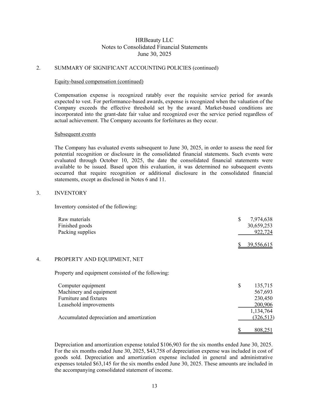 HRBeauty LLC Notes to Consolidated Financial Statements June 30, 2025 2. SUMMARY OF SIGNIFICANT ACCOUNTING POLICIES (continued) Equity-based compensation (continued) Compensation expense is recognized ratably over the requisite service period for awards expected to vest. For performance-based awards, expense is recognized when the valuation of the Company exceeds the effective threshold set by the award. Market-based conditions are incorporated into the grant-date fair value and recognized over the service period regardless of actual achievement. The Company accounts for forfeitures as they occur. Subsequent events The Company has evaluated events subsequent to June 30, 2025, in order to assess the need for potential recognition or disclosure in the consolidated financial statements. Such events were evaluated through October 10, 2025, the date the consolidated financial statements were available to be issued. Based upon this evaluation, it was determined no subsequent events occurred that require recognition or additional disclosure in the consolidated financial statements, except as disclosed in Notes 6 and 11. 3. INVENTORY Inventory consisted of the following: Raw materials $ 7,974,638 Finished goods 30,659,253 Packing supplies 922,724 $ 39,556,615 4. PROPERTY AND EQUIPMENT, NET Property and equipment consisted of the following: Computer equipment $ 135,715 Machinery and equipment 567,693 Furniture and fixtures 230,450 Leasehold improvements 200,906 1,134,764 Accumulated depreciation and amortization (326,513) $ 808,251 Depreciation and amortization expense totaled $106,903 for the six months ended June 30, 2025. For the six months ended June 30, 2025, $43,758 of depreciation expense was included in cost of goods sold. Depreciation and amortization expense included in general and administrative expenses totaled $63,145 for the six months ended June 30, 2025. These amounts are included in the accompanying consolidated statement of income. 13
