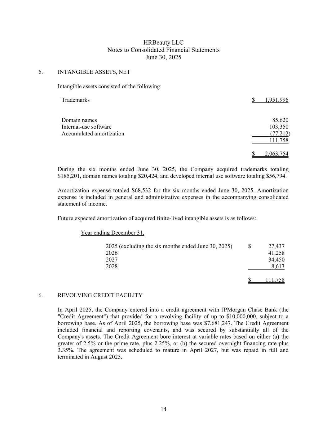 HRBeauty LLC Notes to Consolidated Financial Statements June 30, 2025 5. INTANGIBLE ASSETS, NET Intangible assets consisted of the following: Trademarks $ 1,951,996 Domain names 85,620 Internal-use software 103,350 Accumulated amortization (77,212) 111,758 $ 2,063,754 During the six months ended June 30, 2025, the Company acquired trademarks totaling $185,201, domain names totaling $20,424, and developed internal use software totaling $56,794. Amortization expense totaled $68,532 for the six months ended June 30, 2025. Amortization expense is included in general and administrative expenses in the accompanying consolidated statement of income. Future expected amortization of acquired finite-lived intangible assets is as follows: Year ending December 31, 2025 (excluding the six months ended June 30, 2025) $ 27,437 2026 41,258 2027 34,450 2028 8,613 $ 111,758 6. REVOLVING CREDIT FACILITY In April 2025, the Company entered into a credit agreement with JPMorgan Chase Bank (the "Credit Agreement") that provided for a revolving facility of up to $10,000,000, subject to a borrowing base. As of April 2025, the borrowing base was $7,681,247. The Credit Agreement included financial and reporting covenants, and was secured by substantially all of the Company's assets. The Credit Agreement bore interest at variable rates based on either (a) the greater of 2.5% or the prime rate, plus 2.25%, or (b) the secured overnight financing rate plus 3.35%. The agreement was scheduled to mature in April 2027, but was repaid in full and terminated in August 2025. 14