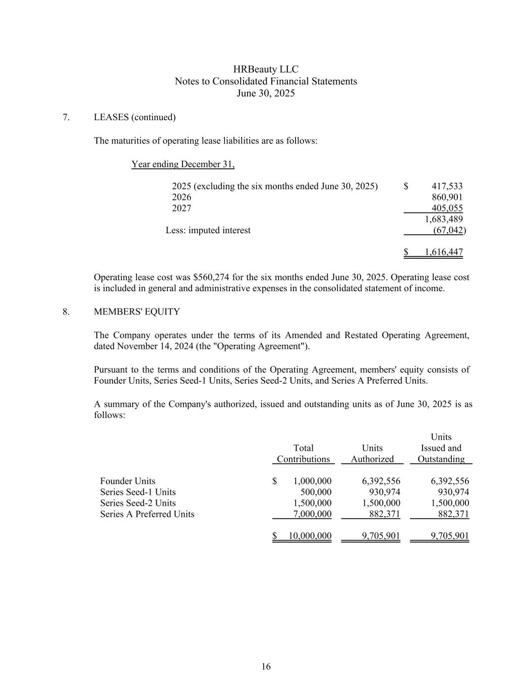HRBeauty LLC Notes to Consolidated Financial Statements June 30, 2025 7. LEASES (continued) The maturities of operating lease liabilities are as follows: Year ending December 31, 2025 (excluding the six months ended June 30, 2025) $ 417,533 2026 860,901 2027 405,055 1,683,489 Less: imputed interest (67,042) $ 1,616,447 Operating lease cost was $560,274 for the six months ended June 30, 2025. Operating lease cost is included in general and administrative expenses in the consolidated statement of income. 8. MEMBERS' EQUITY The Company operates under the terms of its Amended and Restated Operating Agreement, dated November 14, 2024 (the "Operating Agreement"). Pursuant to the terms and conditions of the Operating Agreement, members' equity consists of Founder Units, Series Seed-1 Units, Series Seed-2 Units, and Series A Preferred Units. A summary of the Company's authorized, issued and outstanding units as of June 30, 2025 is as follows: Total Contributions Units Authorized Units Issued and Outstanding Founder Units $ 1,000,000 6,392,556 6,392,556 Series Seed-1 Units 500,000 930,974 930,974 Series Seed-2 Units 1,500,000 1,500,000 1,500,000 Series A Preferred Units 7,000,000 882,371 882,371 $ 10,000,000 9,705,901 9,705,901 16